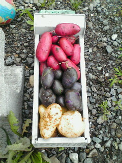 これ、ぜ~んぶじゃがいもです。昨日、夕方子供達と一緒にジャガイモ堀りをした畑には4種類のジャガイモが植えてあるのシュウが持っている本に”じゃがいも”ってタイトルの本があってそこにのっているじゃがいもがぜ~んぶ食べたいと言うので、4種類のジャガイモができたのドロだらけになりながらいっぱい掘りました掘ったお芋はサラダにしました〔皮が赤いジャガイモです。〕それから、ショウの希望で茹でてじゃがバターにもしたよ色は凄いけど、味はジャガイモですおいしいよちなみに、友達の旦那さんは紫のジャガイモを食べている私と友達をと~~~っても冷たい目でみいましたすすめても絶対食べてくれなかったの美味しいのにね。