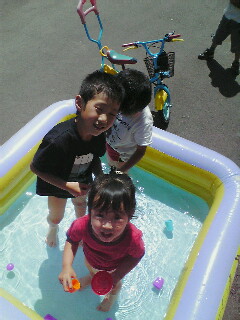 今日の天気はでしたが昨日はとっても暑かった子供達がプール、プールと言うので庭にゴムプールを出してみました少し風があったので足だけ入れなさ~いと服を着たままプールへGO始めは服が濡れないように頑張っていた子供達ですがアイがパンツを濡らした事から少しずつ水の中へ結局、全身ビッショリ楽しそうだったからいいかな~と思って見ていました子供達の喜ぶ声が近所中に聞こえたらしく近所のショウと同年の子が遊びに来たんだけどまだ6月だし、風邪ひかせても責任は取れないって事近くで見てもらうだけにしたの夏だったらいいんだけどね。せっかくプールをふくらましたのに今日はまだまだプール開きには早すぎかな
