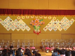 4月5日はシュウの入学式でしたシュウは3組1番仲良しのお友達と同じクラス1学年3クラスなのクラス発表の表を見る前に「シュウくん同じクラスだよ3組」と笑顔で知らせてくれたお友達。お互いとっても喜んでいたよといっても1年生88人中42人は同じ保育園の子なんだよね~。だからクラスも10人以上同じ保育園の子がいる事になる入学式は一番後ろが保護者その前が在校生そして1番前にシュウ達1年生ひな壇もなく、ステージへ向いて座っている子供達もも撮れません担任の先生は女の先生でおばさん先生ちょっと厳しそう校長先生の紹介ではちょ優しい先生らしいけど。式が終わると、クラス写真撮影もちろん親も入りますその後、教室に戻ってホームルームや役員決め終わったのは1時を過ぎていました 昨日は初登校でした。同じ保育園の子が多いせいか早速お友達みんなで怒られてきたみたい先が思いやられる楽しい学校生活を送って欲しいな~。