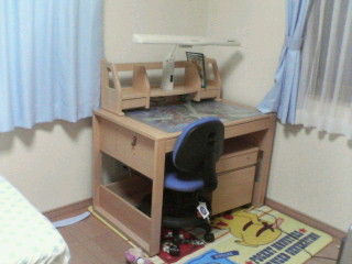 先日おじいちゃんおばあちゃんに買ってもらった机ベッドが届きました机は窓際にも置けるように本棚が少ない物を選びました。ベッドは目覚ましがおける物にしたの(余談ですが、私が子供の頃に使っていたベッドにライトと本棚がついていたために遅くまで暗い中で本を読んでいたのそのおかげで悪くなちゃったので今後悔しているのだから子供のには無しを選びました)シュウは今日からひとりで寝るとはりきっていたのですが夜になると明日からにするよとみんなと一緒に寝ています。早く机で勉強したいんだって今は机にはオモチャがしまってあります保育園でも入学式の時に歌ううたの練習をしているみたいあと少しで1年生今は不安がいっぱいです〔母の〕