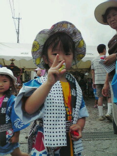 今日は祇園祭だった地区で子供神輿を出すよって聞いたので子供達も参加することにしたのシュウもショウもアイも法被を借りてハチマキしていとこのMIUちゃんも一緒に参加することになったよお神輿かつぐぞ~って気合入れていったんだけど集合場所の近く〔シュウの通っている学校なんだけど〕にゴン中山選手がサッカー教室で来ていたのでシュウととりまくっていたら子供達はお神輿前に疲れ果ててしまいお神輿がスタートしていないのに帰りたいよ~と言い出しちゃったよお菓子とジュースとアイスもらえるよって言って何とか参加させたところが、、、お神輿は小学生の大きい子だけがかつぎ小さい子はただロープをもって歩くだけ休憩だよ~とジュースを配られるって聞いていたんだけど実際は緑茶子供達全く飲まず、ママのどか沸いた~~~って言い出した最後にお菓子もらえるからねって頑張って歩いてもらったんだけど貰ったお菓子はコアラのマーチとあんぱん&クリームパンでしたシュウは友達が一緒に参加したのでとっても楽しそうなんだけどシュウ以外はもう2度と参加しないかもいとこのMIUです ただただ1時間以上ロープをもって歩くだけだったらやらないほうがいいかな???と少し思ったよきっとうちの子はコレが最初で最後の参加になるような気がするだって、シュウ以外3人ともずっと眉間にしわがよった状態で歩いていたんだもんシュウはお神輿に参加というよりお友達と鬼ごっこって感じだった