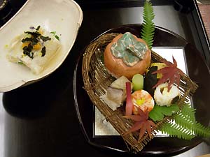 11月27日夕方京都湯の花温泉に日帰り入浴。最初は宿にお客さまをご案内するだけのつもりが、夕食と温泉をごいっしょさせていただくことになりました。温泉自体はやはり湯が枯れて来ているようで、なにやら特殊な石を通して加工した循環のラジウム泉になっていました。そういった事情のもと、ここは女将の才覚で癒しの宿としてアピール。玄関をくぐると、匂い袋の柔らかい香りがお出迎え。まず、お茶(私は抹茶)のサービスを受けてお部屋へ。ミストや岩盤浴みたいなのも別料金で体験できますが、今日はお客さまとの交流がメインなので、軽く普通のお風呂の後お食事に・・・最初の料理。ここのお宿の料理は薬膳ぽいコンセプトで、ステーキや鍋のようなものは無く、地の野菜がメイン。味もかなり薄めです。エルブリ(エルブジ)入っていたのが、泡醤油。ゼラチンで淡雪状にした醤油でお刺身をいただきます。色んな料理が少しづつきれいな器で出てくるのですが、最後の炊き込みご飯の前ですでに体を曲げることが困難なくらい、いっぱいいっぱいになってしまいました。あす、本格的な一泊旅行なのにこんなに詰め込んで大丈夫か...* * * * * * * * * * *