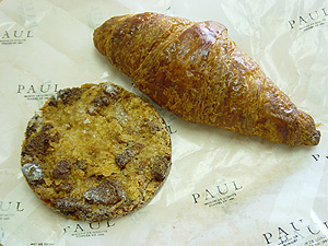 村上ファンドによる株式取得、阪急との経営統合で話題の阪神。阪神百貨店デパ地下のスイーツ売り場が大きく変わっていた。その一つが新しく出店した『Paul』。1898年創業のパリのお店のようで、パスコが経営しているらしい。トレーとトングで自由に取る形式ではなく、ショーケースに入ったものをお店の人に取ってもらう。他にも、列の出来ているクリームパンの店、ケースが空っぽの週がわりの店など、インパクトの強い店はいくつかあったものの、見た目でだんとつに美味しそうだったのが『Paul』。写真左はバターたっぷりの飴でアーモンドやナッツを押し固めたものという前提で買ったものの、実際はパンのクズがメインでアーモンドスライスは少し。ちょっと期待外れ。恐ろしく硬くて、容易に割れない。勿論歯は立たない。手で力任せに割ってまた割って一口大にして口に運ぶ。JT Roots アロマブラック (ホット)と合わせて全部一度に食べきり。ナッツでなくて残念だったけれど、この硬さとバターの香りが美味しく、宿題の『らんま1/2』を読みながら大人な時間を楽しんだのだった。 クロワッサンは人気No.1商品だけあって、なかなか美味。焼きが悪かったり、香りが良くなかったり、油っぽかったり、変にゴワゴワしてたり。。有名店のクロワッサンでも美味しいものにはなかなか出会わないのだけど、 『Paul』のクロワッサンには満足。ソフトで軽く口当たり良すぎるけど。。。ここはケーキも400円を切る値段でけっこう重厚で美味しそうなので次にチャレンジするつもり。帰りに『Fickle Nosh』に寄って、プリントアウトした『こだわりマダム』の4月30日の記事をお渡し。楽しみにしてくださっていたみたい。次回ゆくりできる時に感想を聞くことにして今回はケーキは買わず。『Paul』のヘビーなのを食べたばかりなのでね。また来ま~す!