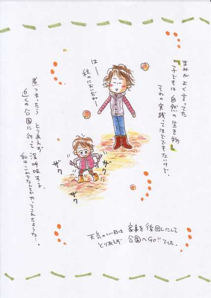 「コラボでコラム大作戦」 Part.12 by 林真未&有田リリコ ****************************** 「あの、しあわせだった日々…」******************************子どもが生まれたとたん、すっきりと片付いていた部屋の中は、なんだかいろいろ散乱して。優雅な主婦の昼さがりは消え去り、まいにちまいにち、小さな子どもにまとわりつかれて、この子が大きくなるなんて想像もできず、この暮らしが永遠に続くような気がしていたあのころ。だけど時は確実に流れて、子どもたちは着々と大きくなって。おむつや絵本やトーマスは、いつの間にか部屋から姿を消した。しつこく抱っこをせがんだあの子も、今では、手をつなぐことさえいやがるのだ。ざつぜんと、わさわさと、暮らしていたあの、小さい人との夢中の日々。ただ毎日を暮らすのに精いっぱいで、しあわせかどうかなんて、考えもしなかった。だけど、今ならわかる。あれは、この上もなくしあわせなじかんだった。戻りたい。あの、しあわせだった日々…。********************************************************************PROFILE林真未=カナダ・ライアソン大学認定・家庭支援職(ファミリーサポートサティフィケート)ファミリーライフエデュケーター練馬区在住、小3、小6、中3の母。36歳の時に、1才・4才・7才の子どもとワーカホリックな夫をかかえ、パソコンは知らないゎ、英語は苦手だゎという瀕死の状態で、カナダ・ライアソン大学の家庭支援職資格インターネット通信教育を始め、家庭支援を仕事にしてしまった向こう見ずな女。有田リリコ=イラストレーター世田谷区在住、小4の母。のらりくらりとやってきて、ふと気がつけば人生折り返し地点。いままでのだらだら半生を、最近はげしく後悔している女。