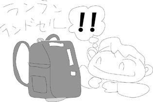結局、寝る前まで家の中をしょったままずっと歩いていました。で、寝る時も枕元のそばにおき(今日だけは、特別)電気を消すまで嬉しそうにいつまでも開け口をカチャっとさわってみたり、カバンのなかを眺めてみたりしていました。どうやら、本人はいたく気に入ってくれたらしいみたい。学校にいってもその調子でがんばってほしいものです。