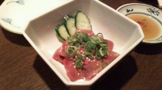 焼鳥のうまい店ということで教えていただきました。焼鳥の分野では「これを食べたら大往生」級の大ヒット店であった。見てください、この神々しいまでにテリのある生キモ。ささみの刺身。この色合いは世界平和の象徴だ。背肝。イエス・キリストが生まれたとき、博士たちは贈り物に、黄金、乳香と没薬のほかに背肝も持って行ったらしい(うそ)。ずりの刺身。奥歯でしゃりしゃりとかみしめながら、思わず鶏さんが尊い命を投げうって、われわれ人間に祝福を与えてくれたことに思わず涙します。その後、手羽元、ねぎま、皮、皮酢、そうそう、最後のスープもトレビアーン。これらとともに大量のアルコールもともに胃中に納まる。すばらしいお店でした。また来たいと思います。こういうグルメ本には載っていないような、隠れた名店に出会えた日は最高に幸せです。もちろん、ご一緒しました方々とのおしゃべりも最高に楽しかったです。