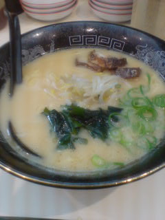 スープは口当たりがよく、麺はストレートでモヤシにネギにワカメがはいってます。