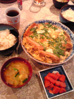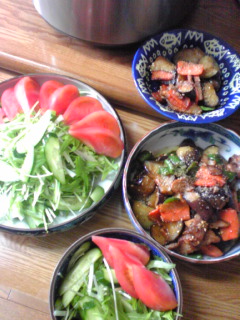 【夕べのウチご飯】☆豚薄切りの牛蒡巻き(昆布)☆野菜サラダ(水菜・きゅうり・トマト)☆鍋しぎ(茄子・人参・ピーマン・解凍焼き豚)☆玄米多めの15穀米☆えのきともやし・揚げのお味噌汁*****************************************『新しい職場で、カツラを被った母がボランティアでうろつくのに遭遇』・・・という夢を見ました。ビニール袋の大きいヤツ(風呂のレンタルバスタオルが個別セットされてるもの←リアルw)に、色とりどりのお薬がいっぱい詰まっていて。患者さんに配る役割だそうで、その袋を抱えていました。。。夢の中で、なにやら積もり積もった文句を喚いて。最後に『バカーーーーーーーー!!!』と叫んだところで・・自分の声にビクッと覚醒。ダーリンも起こしてしまった。転職と、母のカツラのストレス・・どんだけ・・