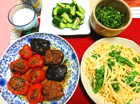 ​​ ​ 昨夜の晩ご飯、真っ赤なパプリカと椎茸の肉詰めです。