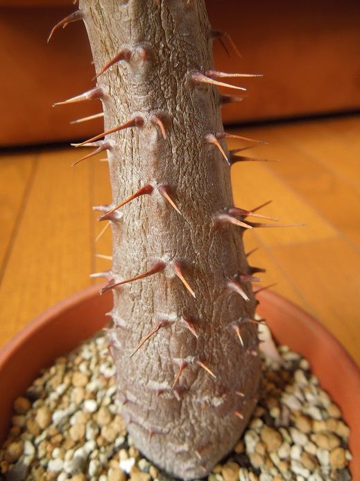 パキポディウム・ホロンベンセということで入手して数年経つパキポですが、まだ一度も花が咲いたことがありません。毎年数枚づつ葉を出して少しは大きくなっていますが、この時期休眠するんだかしないんだか、葉が落葉し始めたと思って水遣りを控えると幹に皺が出来たり凹んだり。冷え込んでくる時期なので恐る恐る水をやると、しっかり回復します。我が家でも気難しいパキポです。