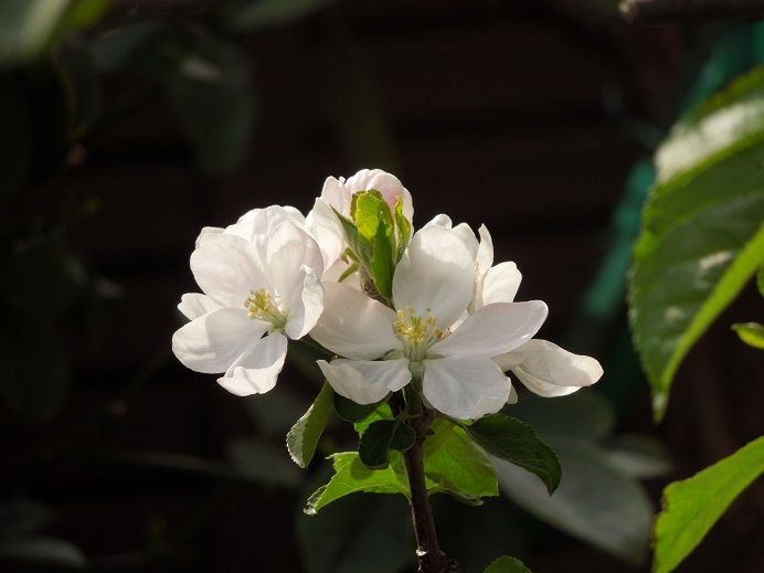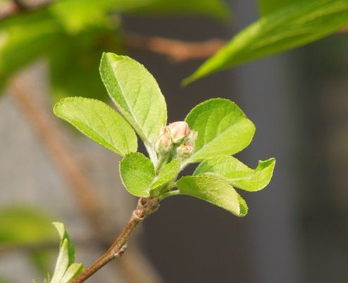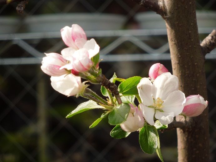 今年はリンゴの開花が遅れましたがやっと咲き始めました。通常は開花した後に新葉が出始めますが、今年は開花と新葉が同時に出始めました。