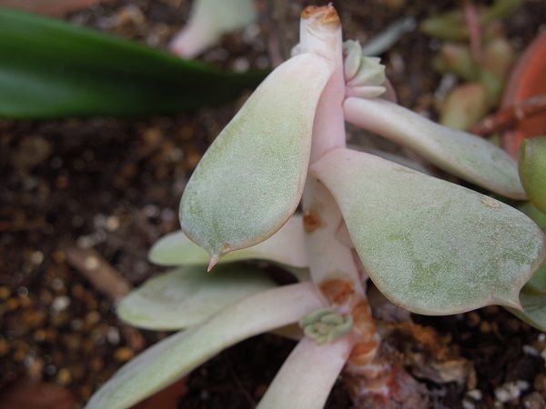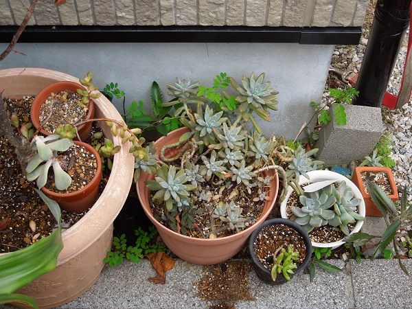 数年前にいくつか買って生き残っているエケベリア、当初は緑色の花みたいに見えていい形でしたが、屋外放置栽培でいつのまにか葉もボロボロ、徒長して無残な姿になってしまいました。