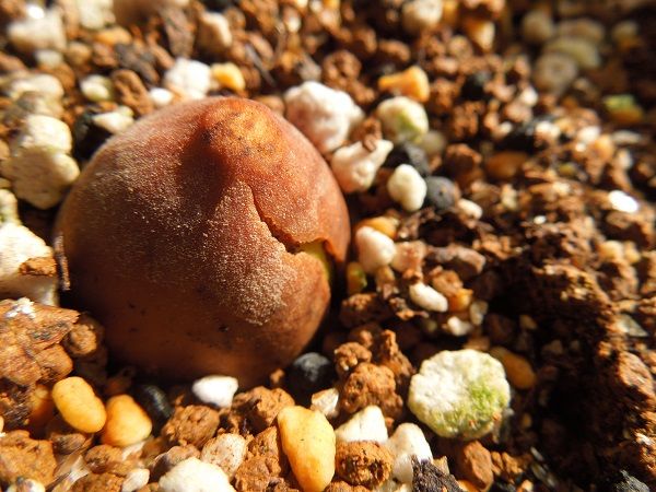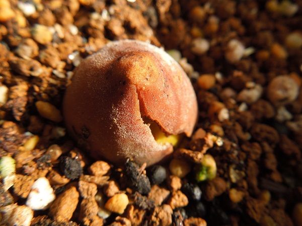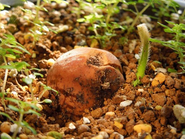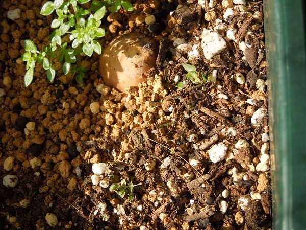用土の乾き具合を見ていたら芽が出ているのを発見、8月下旬に発根してから約3か月。