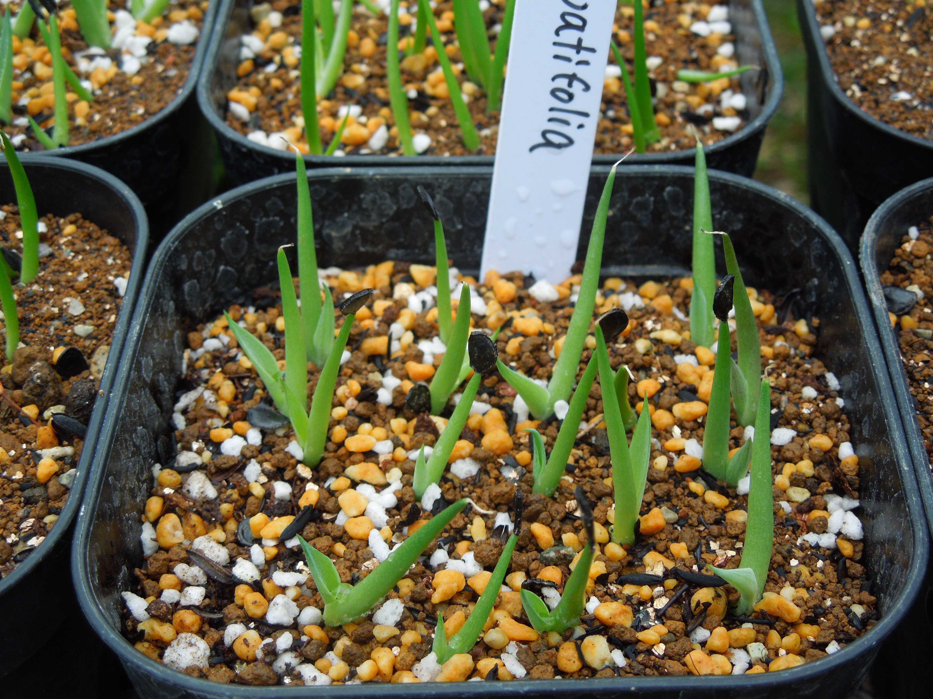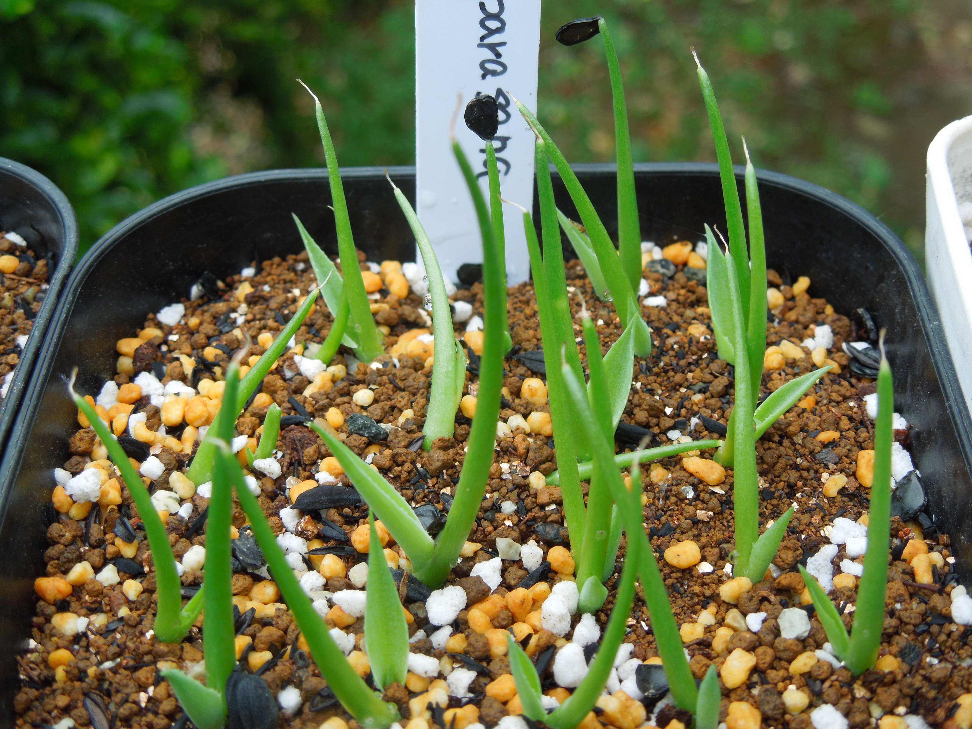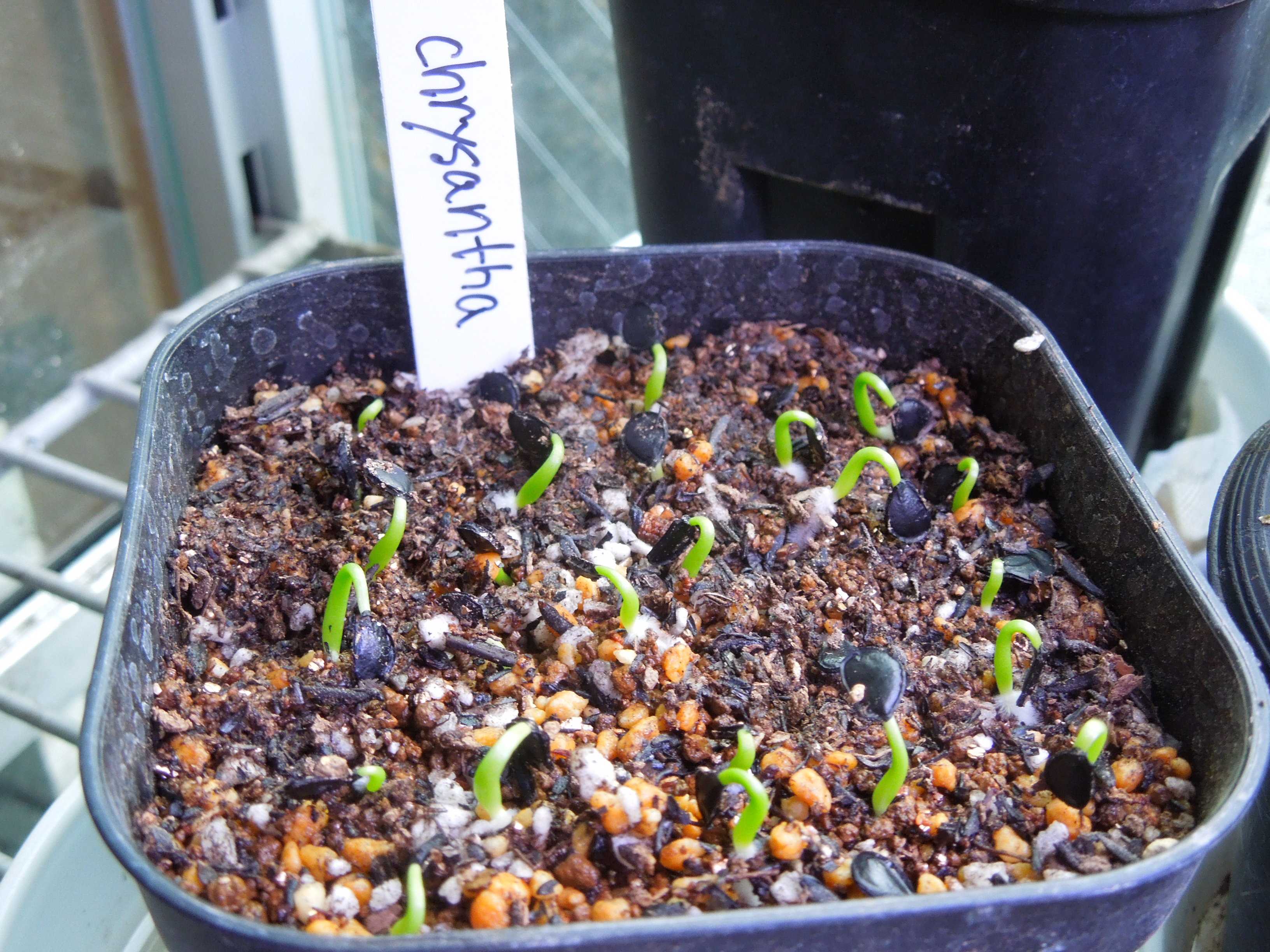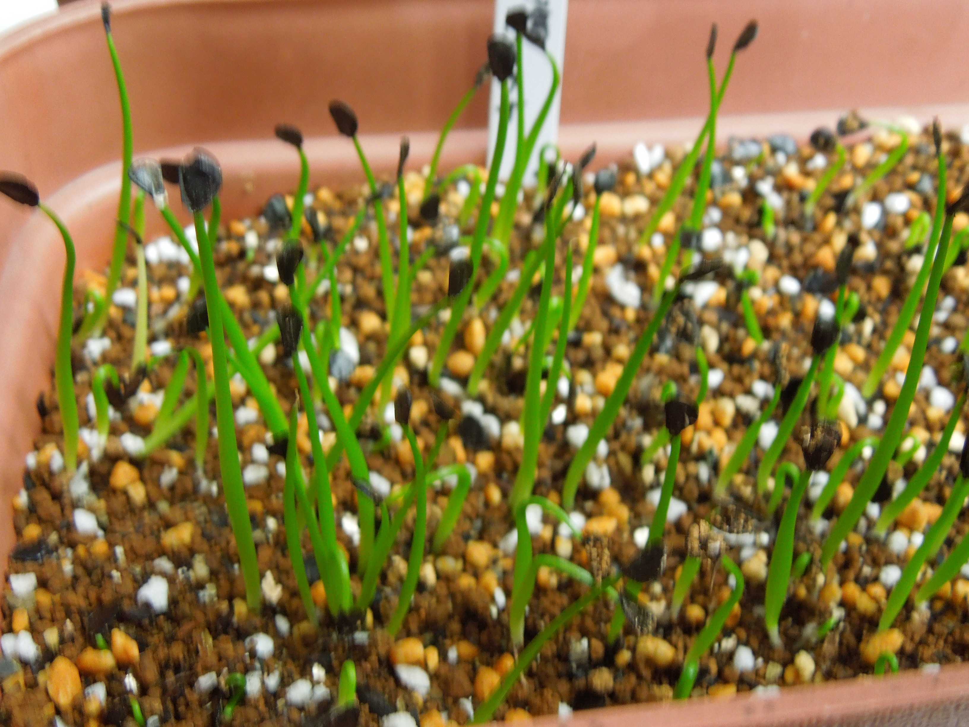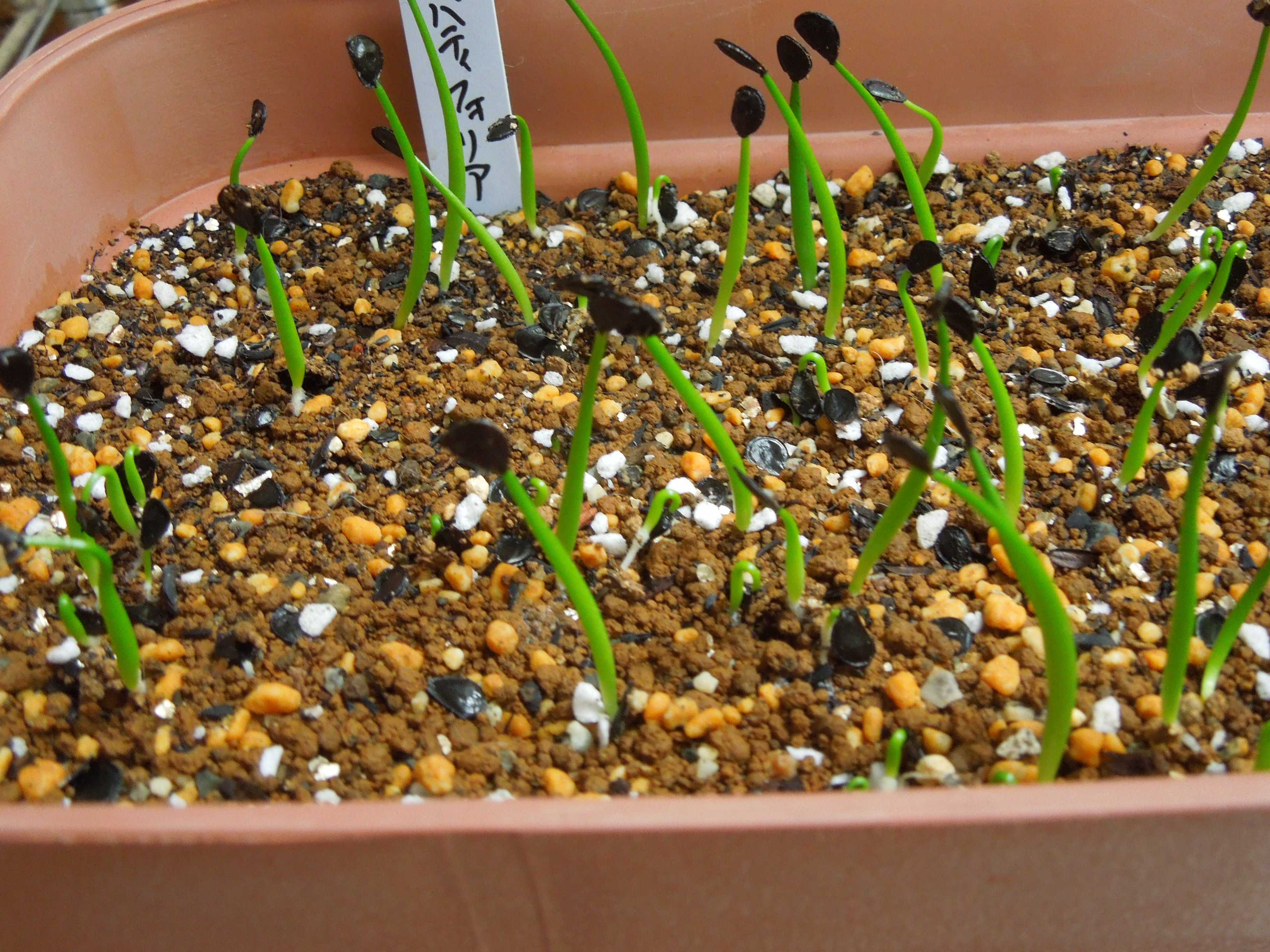 初期の発芽種子は連休明けから、屋外ブロック塀の上で雨ざらし。
