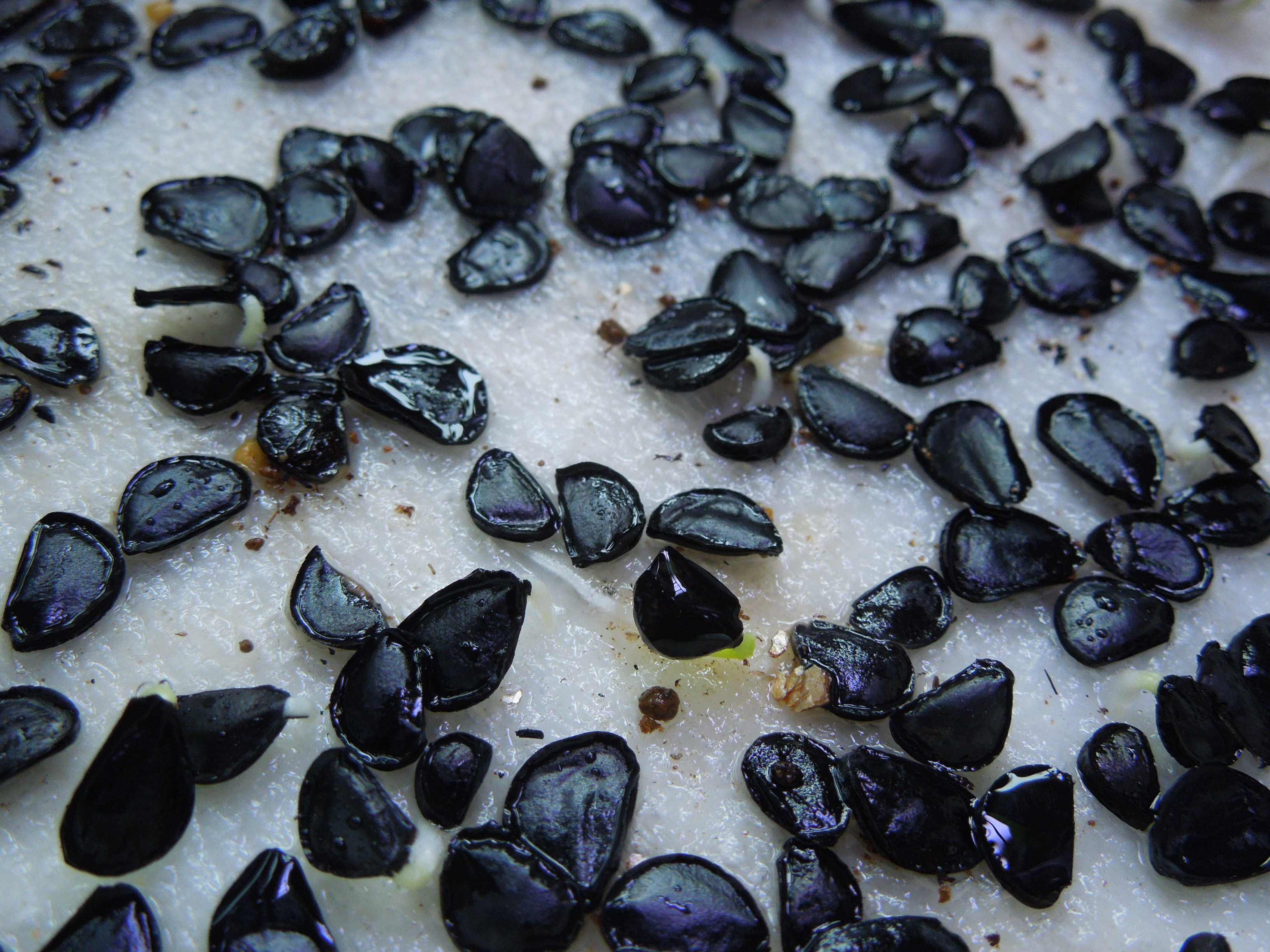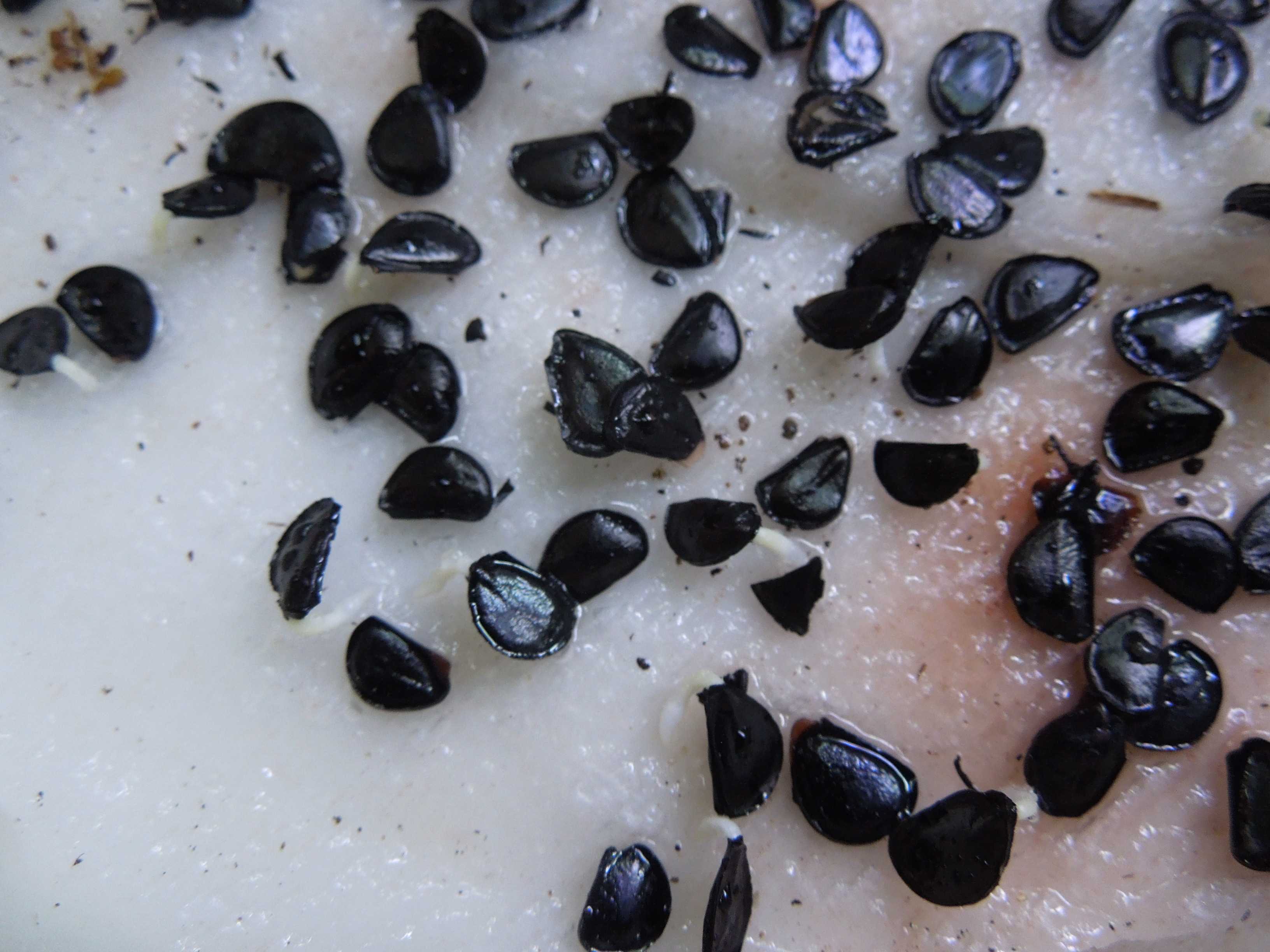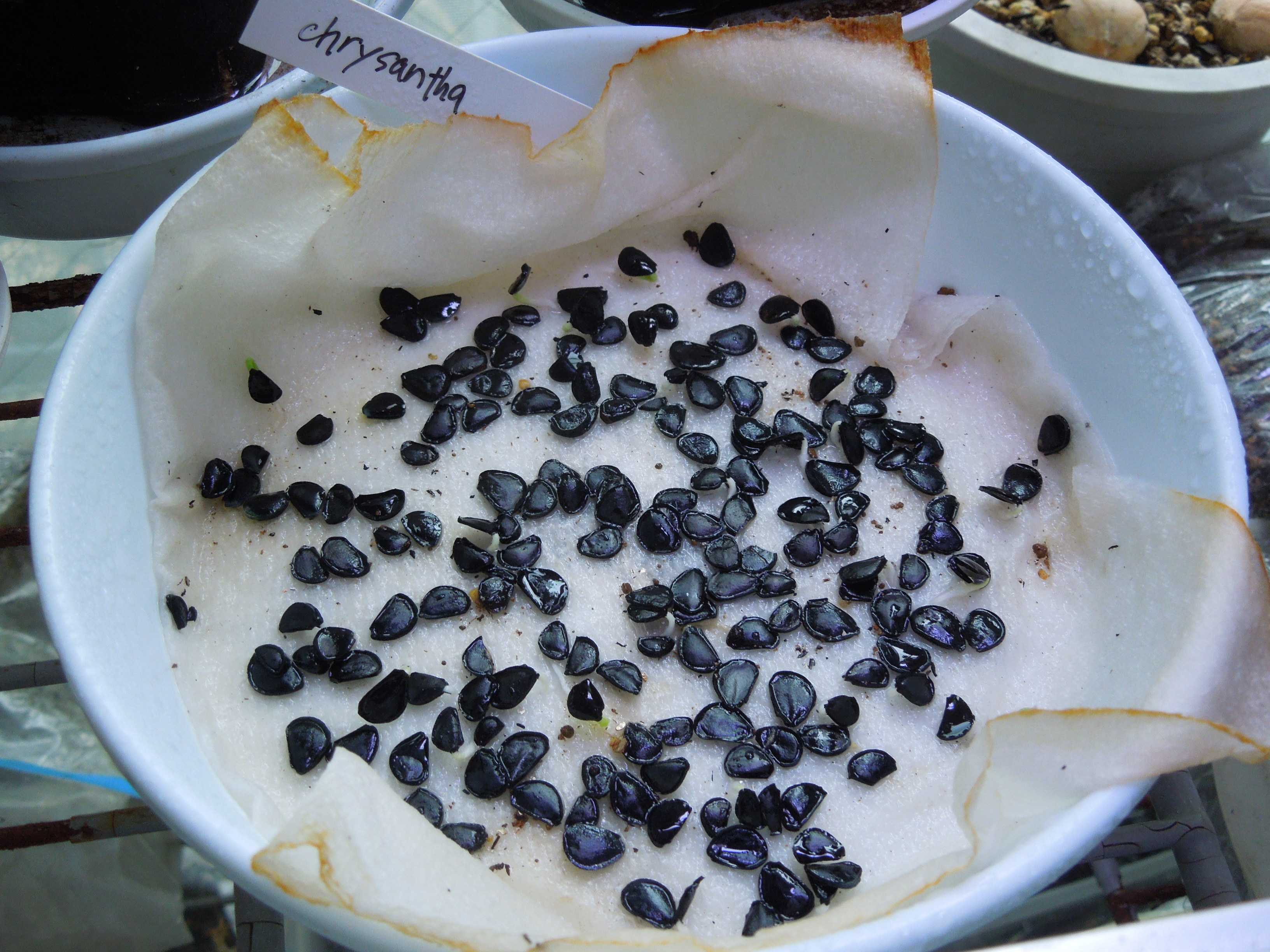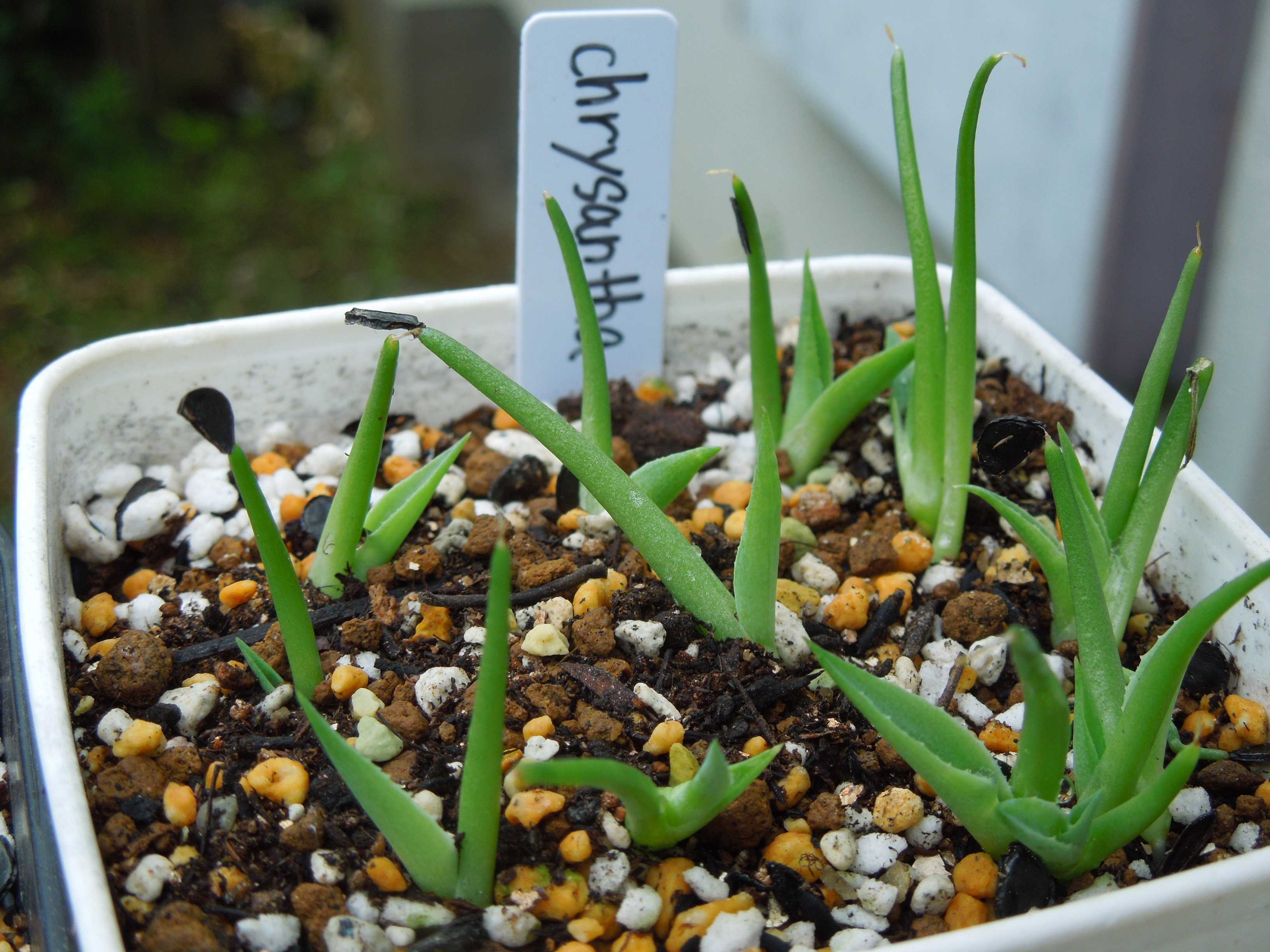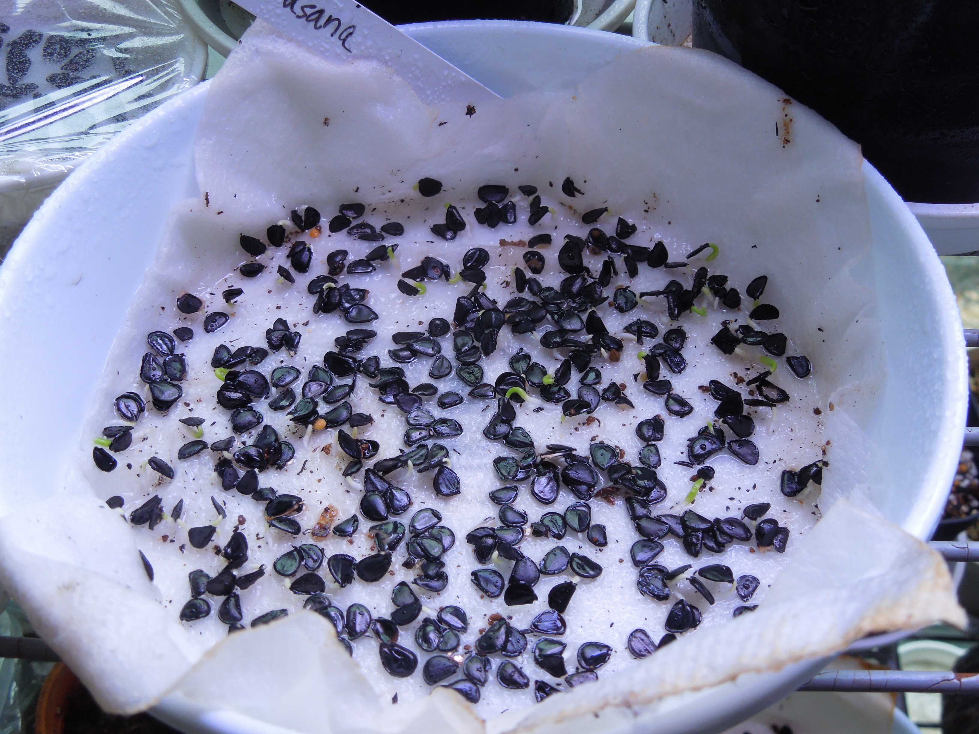 初期の発芽種子は連休明けから、屋外ブロック塀の上で雨ざらし。
