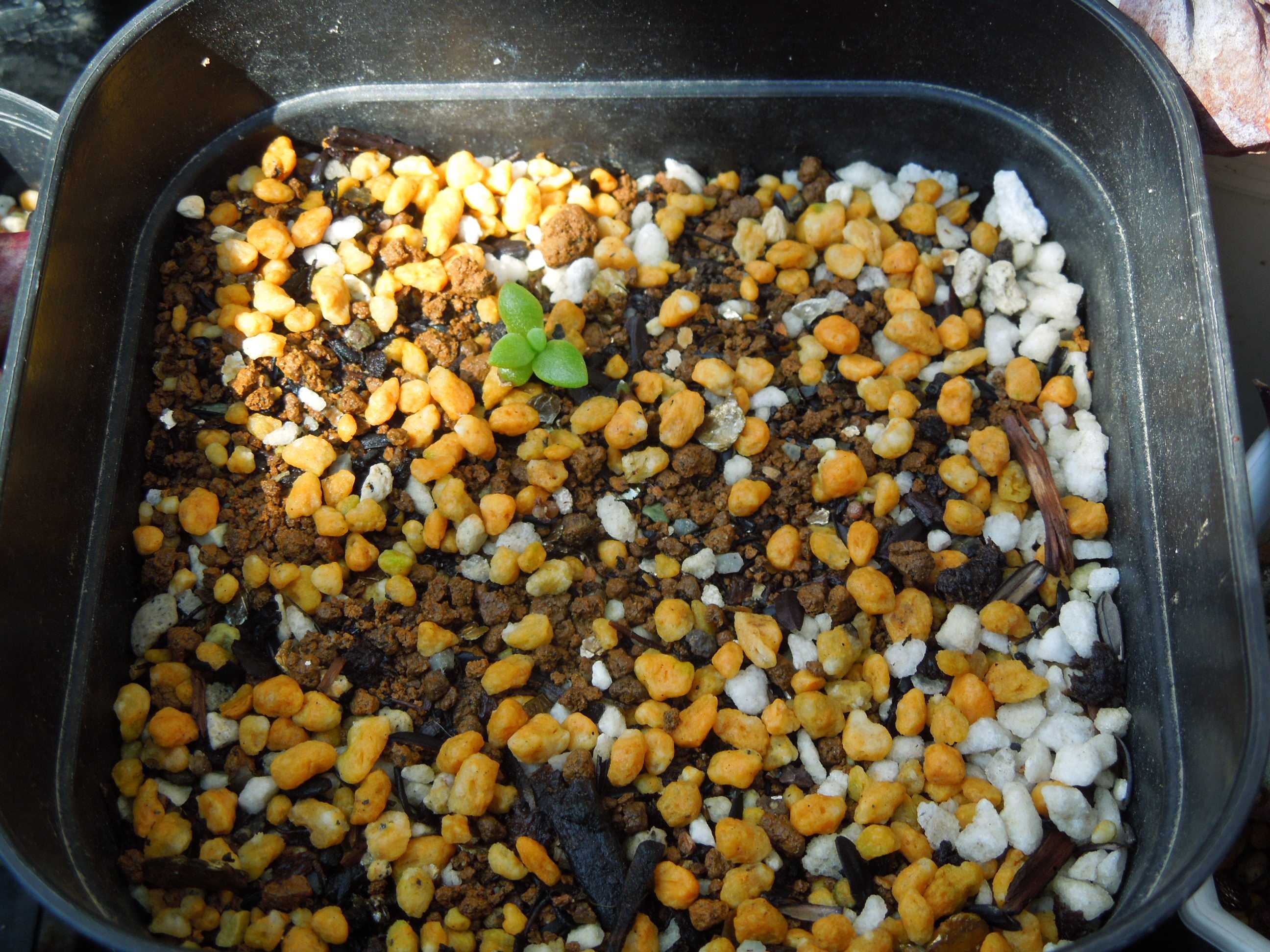 粉みたいな種でプラ鉢にパラパラと振り撒いた。