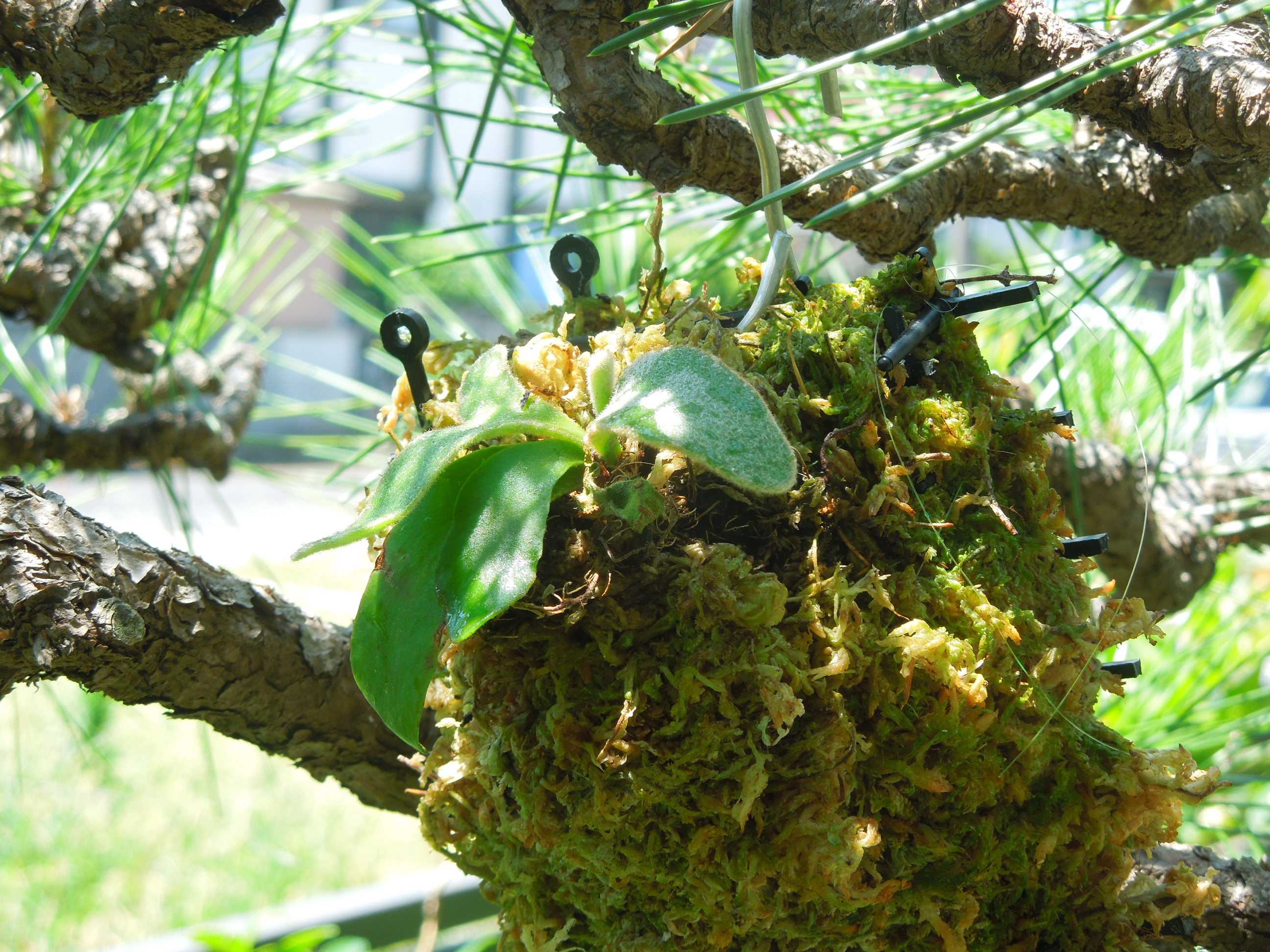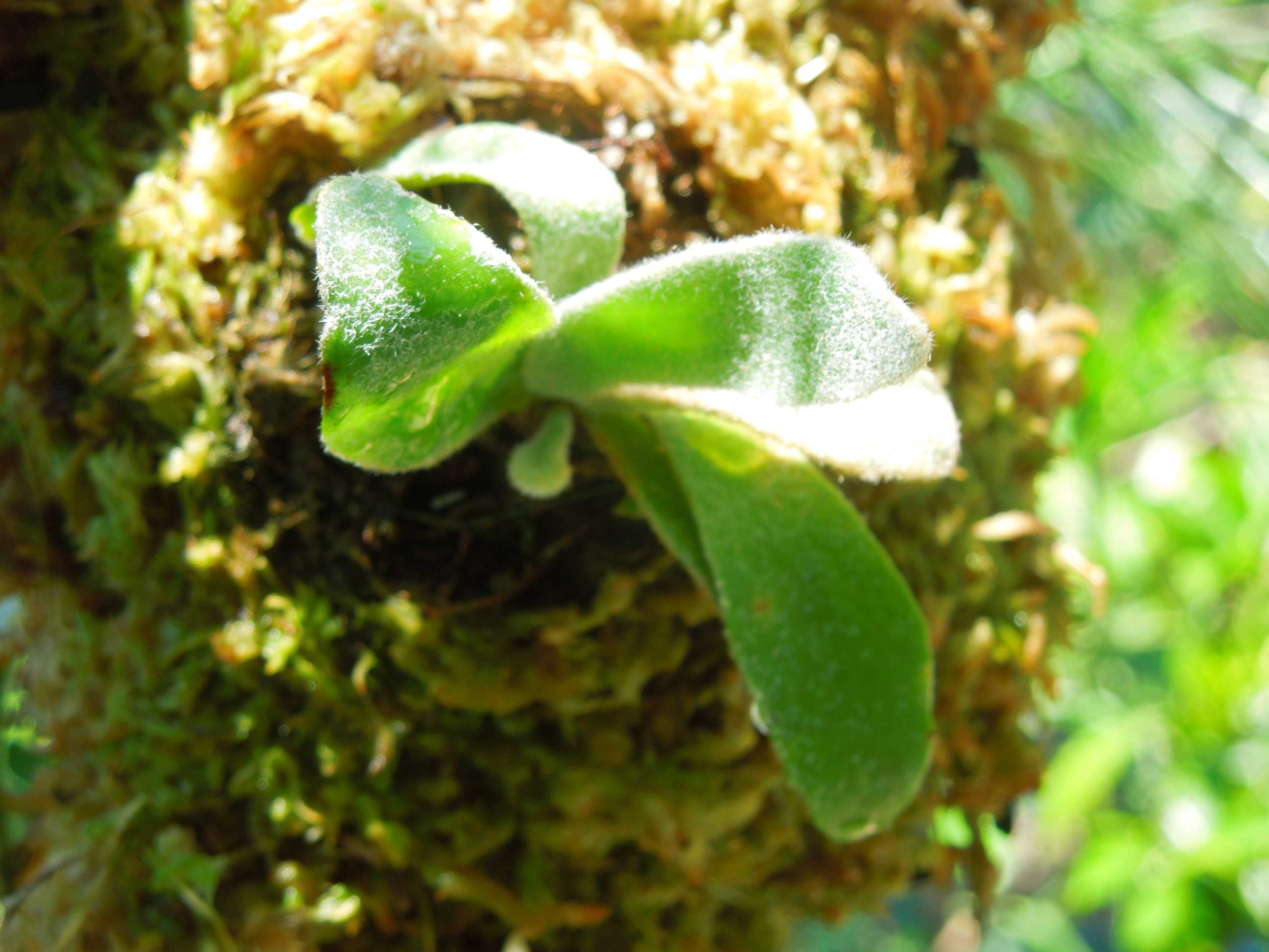 猫避けマットで水苔を挟んだ台に付けたら、裏側からも子株が出ている。