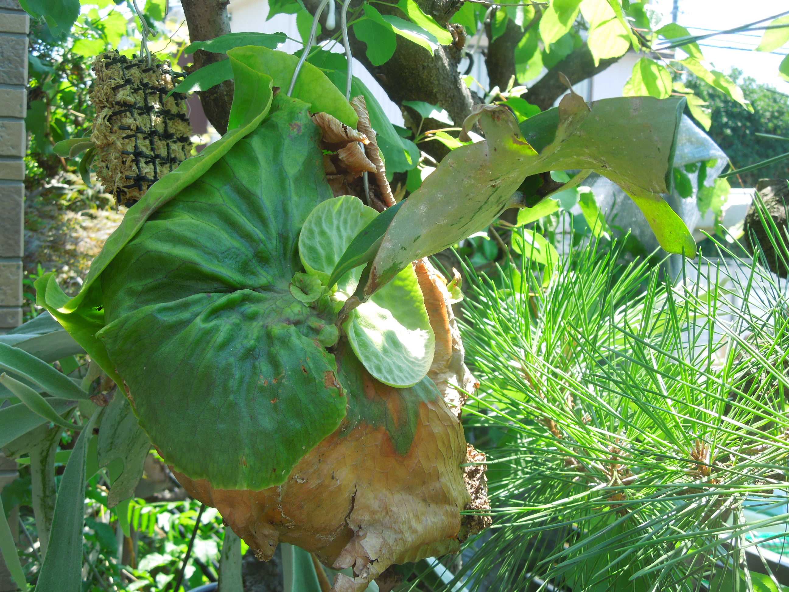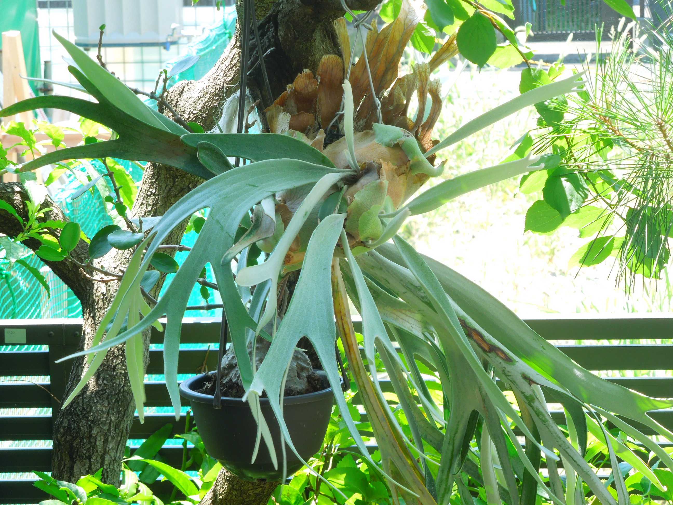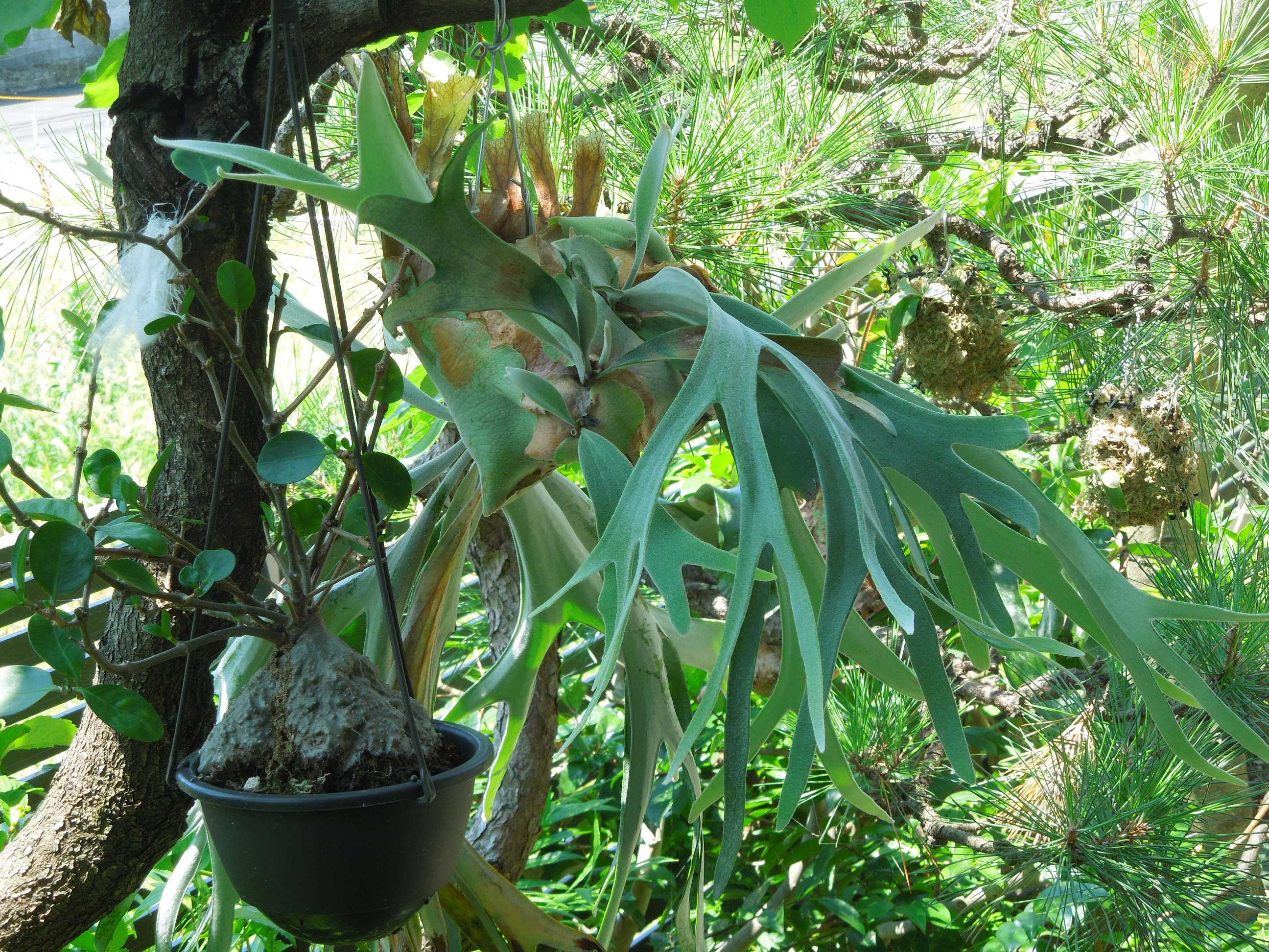 アンズの木と松の木に吊したビカクシダ。
