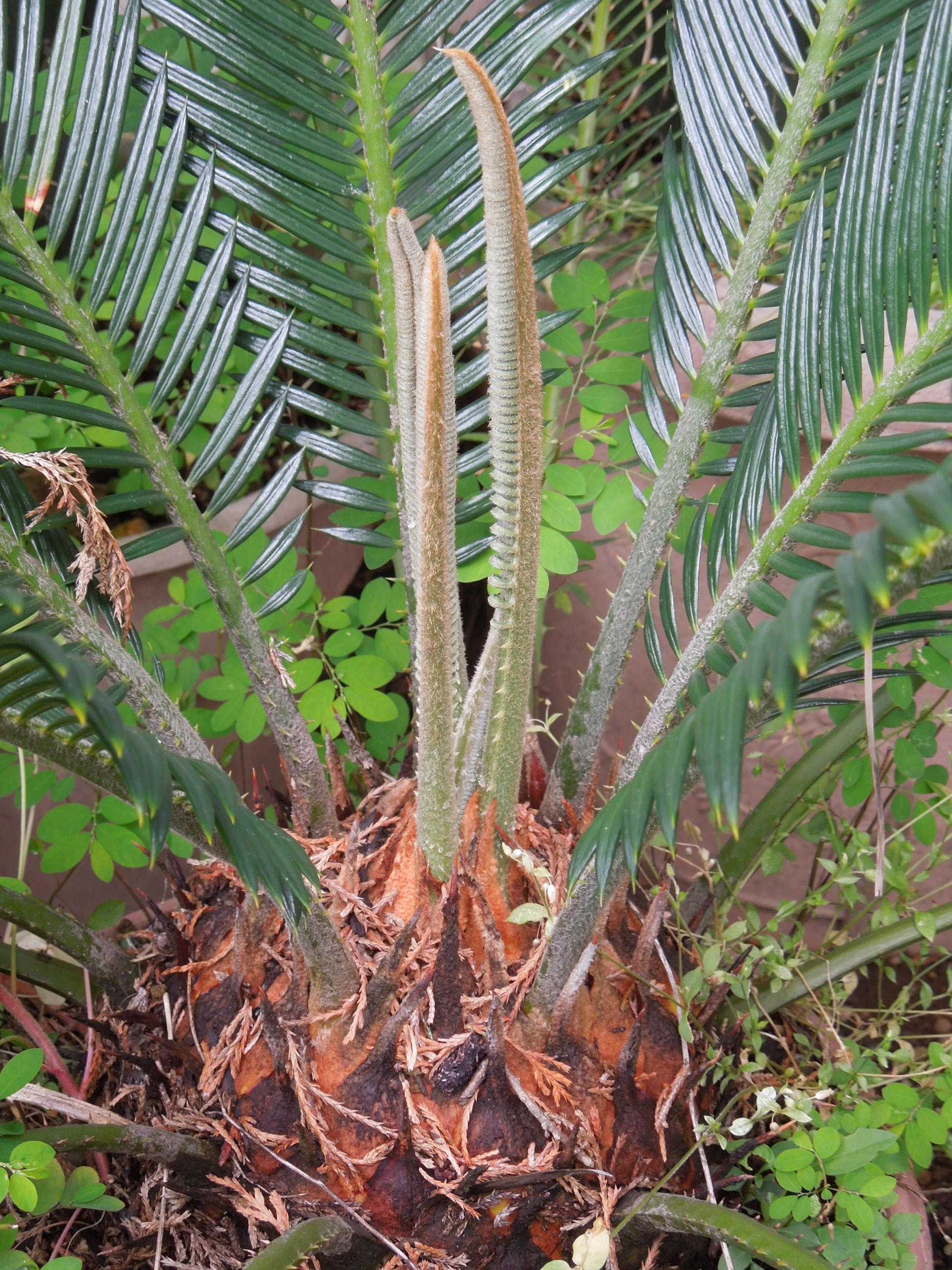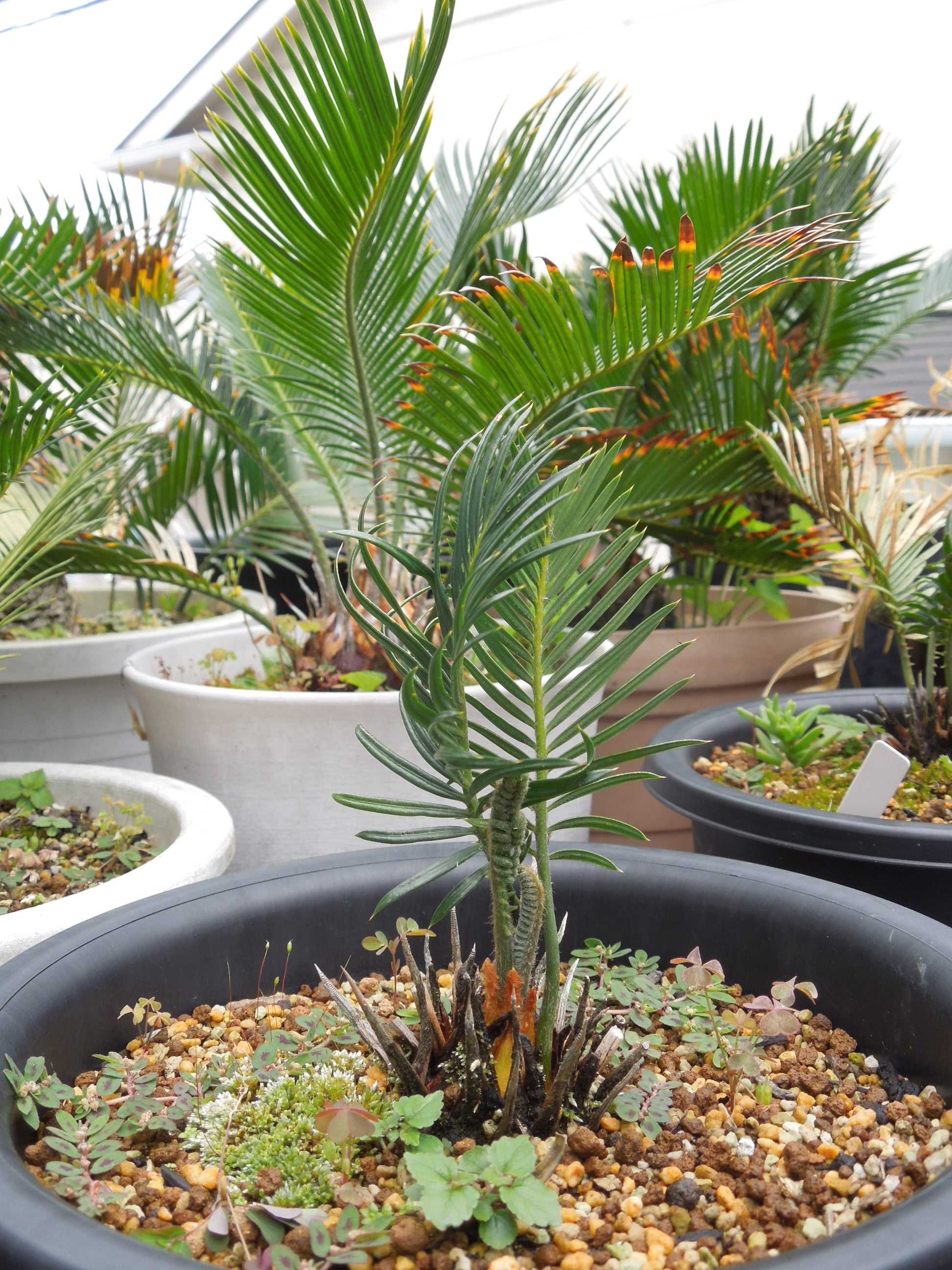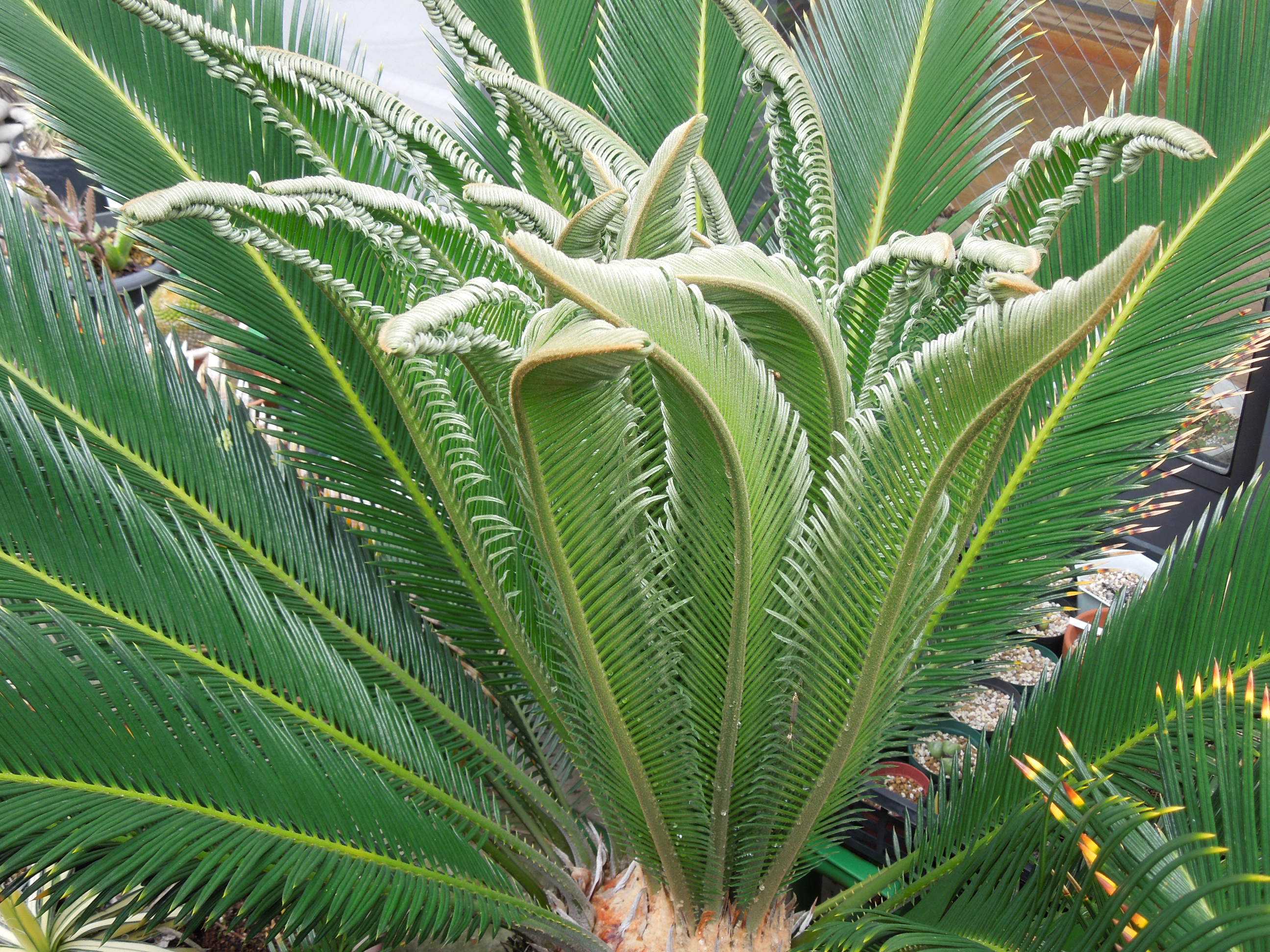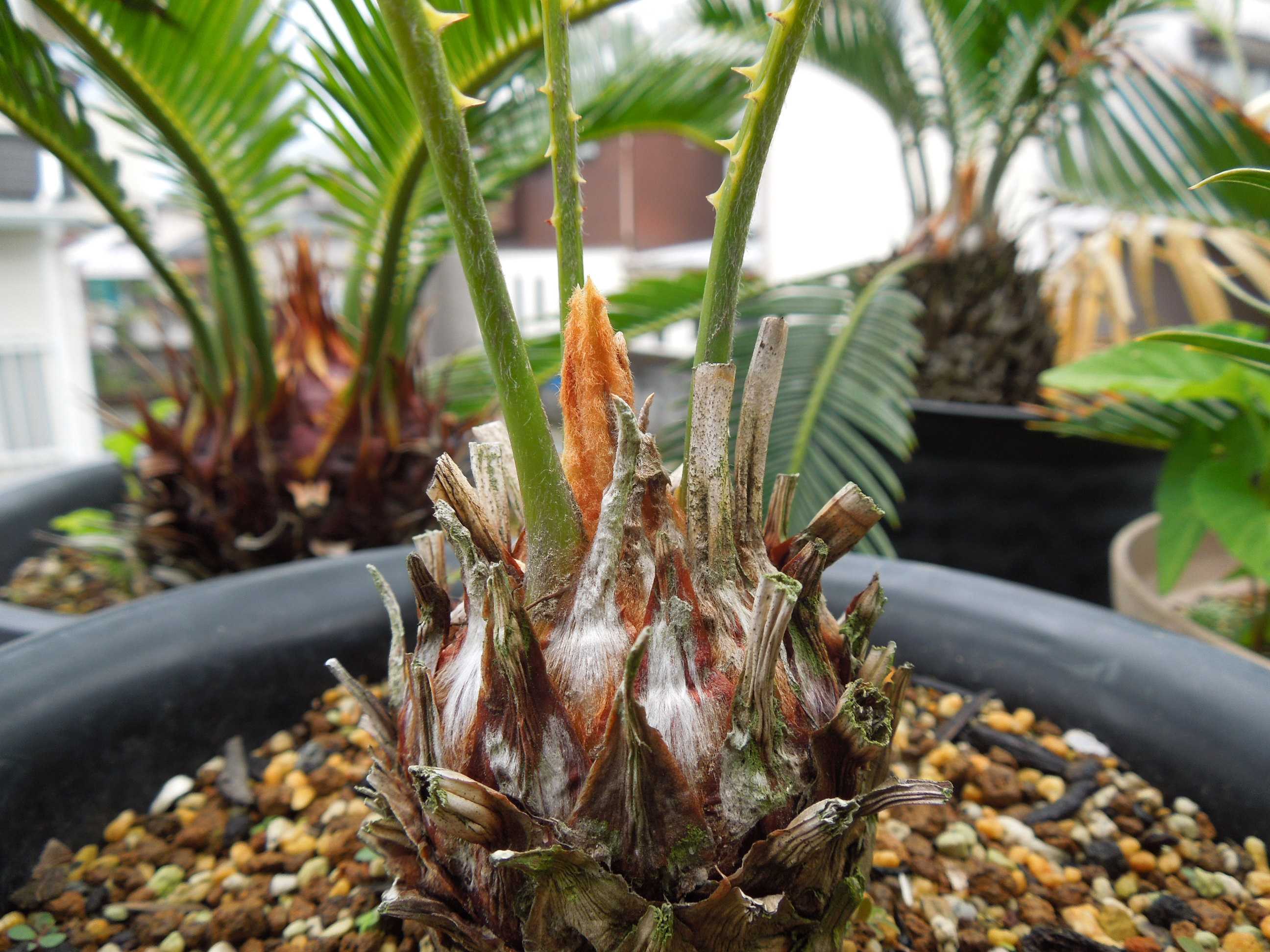 今年、最初に新芽を出した金環ソテツ(レボルタ・オーレア)はほとんど葉を展開してきた。