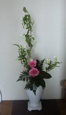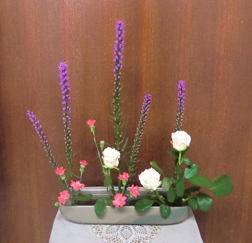 3日続けてという最近では珍しいお天気になっています。昨日も実家の母に母の日のプレゼントの鉢植えを持って行ったときも、きょうもそうですが、実は、マンションの敷地内の駐車場には主人の車が留めてあって、私の車は少し歩いて行くので、雨の日に荷物があると大変なのですそれで、きょうは花器は特別持って行くのはやめました。学校ではきょうは教頭先生方の研修会があったせいなのか、いつもより車を置くところが無くて、玄関までいつもより遠いところから、傘をさすのはあきらめてクラブの全員の花を運んだので、やはり、お天気の悪い日は何かと大変です。きょうの玄関の花は、わざとクラブ活動の花と同じものを使ってみました。こんないけ方もできるよと参考にしていただければ・・・ 今年の伝統芸能クラブは、4月初回はクラブの説明会ということで、2回目のきょうが実質の初回です。いつもは水曜日ですが、今回だけ月曜日。次回は来週の水曜日です。その後、お筝もあり、またお花もあるというようにランダムに混ざっています。初回のきょうはリアトリスと薔薇、これを600円で用意してくださいました。クラブは600円の花代でやっていますので、お花屋さんには本当にいつもお世話になっております。にほんブログ村 ブログランキングに参加しています。 きょうもポチっとしていただけたら幸いです
