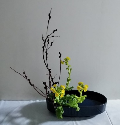 来週の土日が1月の支部研究会なので、土曜日教室は今年最初のお稽古で研究会のお稽古です。この「ひらくかたち」は研究会の花材ではありません。 本科の課題は金葉小手毬3、ストック3「色彩盛花・直立型」 師範1の課題は黒芽柳3、菜の花3「色彩盛花・直立型」 師範2の課題は赤芽柳5、菜の花3「色彩盛花・傾斜型」 カリキュラムの改定を受けて本科から盛花です。 本科さんは初めての盛花になりました。きょうは中学生がインフルエンザで急にお休みになりました。1週間後には治っているはずなので、研究会には出たいというので、お稽古を何とか考えてあげたいと思っていますが明日のこども教室のお子さんからもインフルエンザでお休みするという連絡が入っています。昨年のうちに1回流行ったインフルエンザですが、やはりもう一波来そうですね。にほんブログ村 ブログランキングに参加しています。 きょうもポチっとしていただけたら幸いです