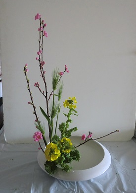 今月最後のお稽古は、桃の節句も近いので桃です。そして定番の青麦と菜の花です。ですが、残念ながら欠席が多くアップできるのは2枚だけになりました。 きょうは“まどか”花器に「たてるかたち(応用)」にしました。にほんブログ村 ブログランキングに参加しています。 きょうもポチっとしていただけたら幸いです