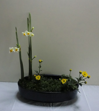 私も今年初の親先生の教室に行きました。来週の研究会の課題では師2~2脇までが水仙の様式や様式に準じたかたちになっていますが、親先生の教室にはちょうどこのクラスの人もいないので、今回やってみましょうと水仙が用意されていました。先生は、3級と同じ水仙3本を小判型花器にというつもりで注文したようなのですが、本数は予備にと多く入ってきていましたので、私は5本でいけてみました。下草に日蔭ではなくミリオクラダスが入っています。研究会ではないので高い日蔭を使わなくてもということです。研究会も師2と准はミリオです。ミリオは切って入れるだけなので簡単ですが、実際はミリオは浮いて来るので、日蔭よりもいけにくいです。小菊が赤小菊のうえにぜんぜん咲いていないのが残念ですブログランキングに参加しています。 きょうもポチっとしていただけたら幸いです