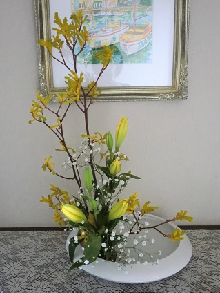 パソコンのHDDを新しくするのと、容量を増設するのとで、春にお直しに出したのですが、それ以来おかしいなと思いながら使用していた部分があって、今回思いきって電話をしてみたら、来て下さって、持って帰って直してくださるというのでお願いして、2日ほどパソコンがなかったので、更新が遅れました来週は12月の研究会のお稽古になるので、今週は、同時に行われる復活研究会に出る方には、課題発表がない復活ですが、予想される瓶花をと思いました。12月の通常研究会が水仙や万年青など様式が多く盛花なので、復活研究会は瓶花だと予想されます3級の方と2脇の方が復活に出席されるので、もっと下のクラスの方には盛花にしました。ユーカリ、ガーベラ、霞草「色彩盛花・傾斜型」 まだ盛花のお稽古を始めたばかりで、直立型しか教えていなかったのに、今月の研究会で瓶花の傾斜型が課題になってしまった師範2のS子さん、盛花の傾斜型は初めてでした。そして、盛花はもうお手の物のMちゃんです。この日、瓶花用に用意したお花をお持ち帰りになって、自宅で復活研究会のお稽古になった方もいらっしゃいます。頑張ってね いつもありがとうございます!きょうもポチっとお願いします