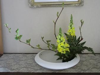 きょうは親先生の教室に行ってきました。来週が研究会のお稽古なので、先生は特に注文はせずに花屋さんにお任せにしたらしいのですが、ちょっと変わった取り合わせとなりましたつつじ、金魚草、鳴子百合 という取り合わせ。多分つつじは錦紅花で、これを枝モノとして主材にしてくださいという感じになっていました。そのようにいけていた方もいましたが、私は錦紅花を低く使ったほうが良いと思ってこんな風にいけてみました。来週に控えた研究会で3級の課題が“ひびき”で「ひらくかたち」なので、指導するためにちょっと練習こっちも見てね 「おばさんのつぶやき」 ブログランキングに参加しています。 きょうもポチっとお願いします