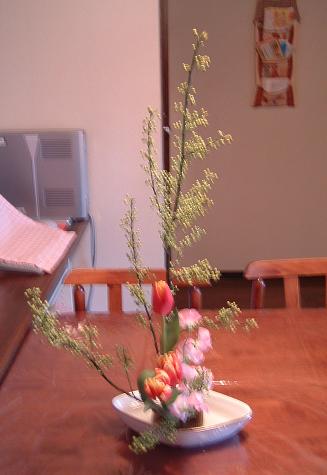 アオモジ、チューリップ、スイートピー「たてるかたち」S子さんの作品です。