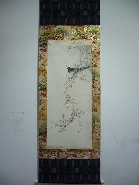 There many kinds ofkakejikuSansui-ga feature ink-brush landscape paintings Kacho-ga depict seasonal flowers or birds, Butsu-ga convey Buddhist symbolism.掛軸には多くの種類があります。山水画は自然の景観を墨で描いたのが特徴です。花鳥画は四季折々の花や鳥を描いています。仏画は仏教の象徴を表す絵画です。この掛軸は個展で発表した古布を使った江戸末期の浮世絵師の鳥文斎栄之(ちょうぶんさい、えいし)です。最近生活に困ってこれを祐徳博物館の館長さんに格安でおゆずりしました。すこしは仕事がきますように・・・