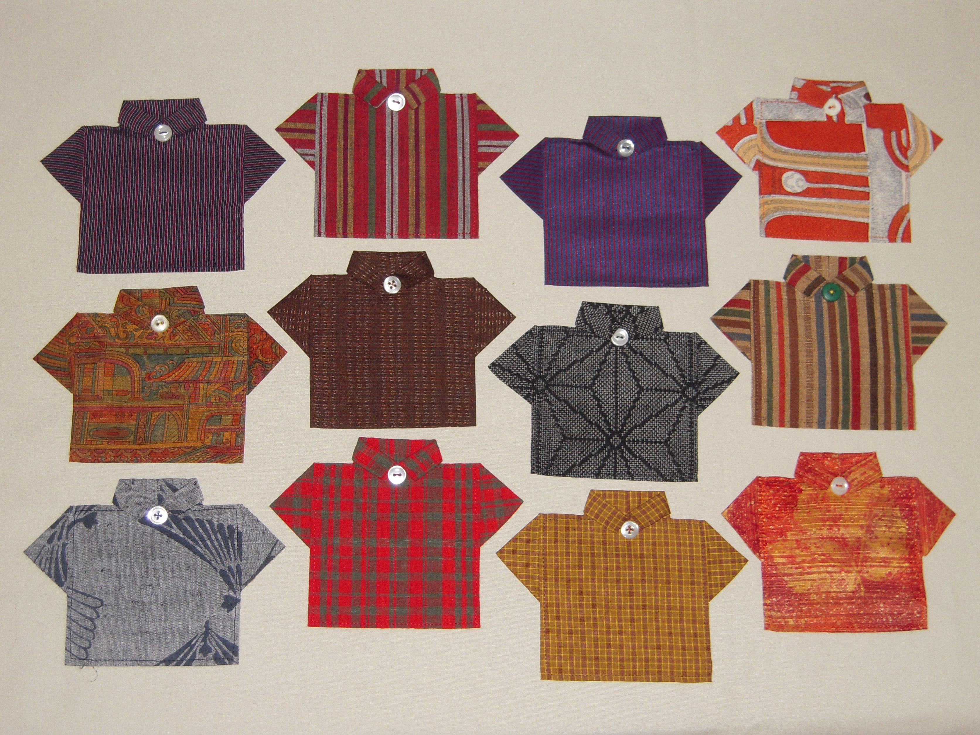 友人・知人から頂いた沢山の着物・帯で思う存分着物リフォームを楽しできた13年間です。もうそろそろ整理しなくてはなりません。まずハギレからと思って袋に詰めるのですが、まだ使えるかもと思ってしまうのが整理がなかなか進まない原因です。思い出のある生地は、簡単な小物を作って少しでも残しておきたいと思います。片付けの手を休めて、シャツ型のコースターとキャラメルポーチを作りました。あまり実用的でないかも知れませんが、プレゼント用にと思っています。