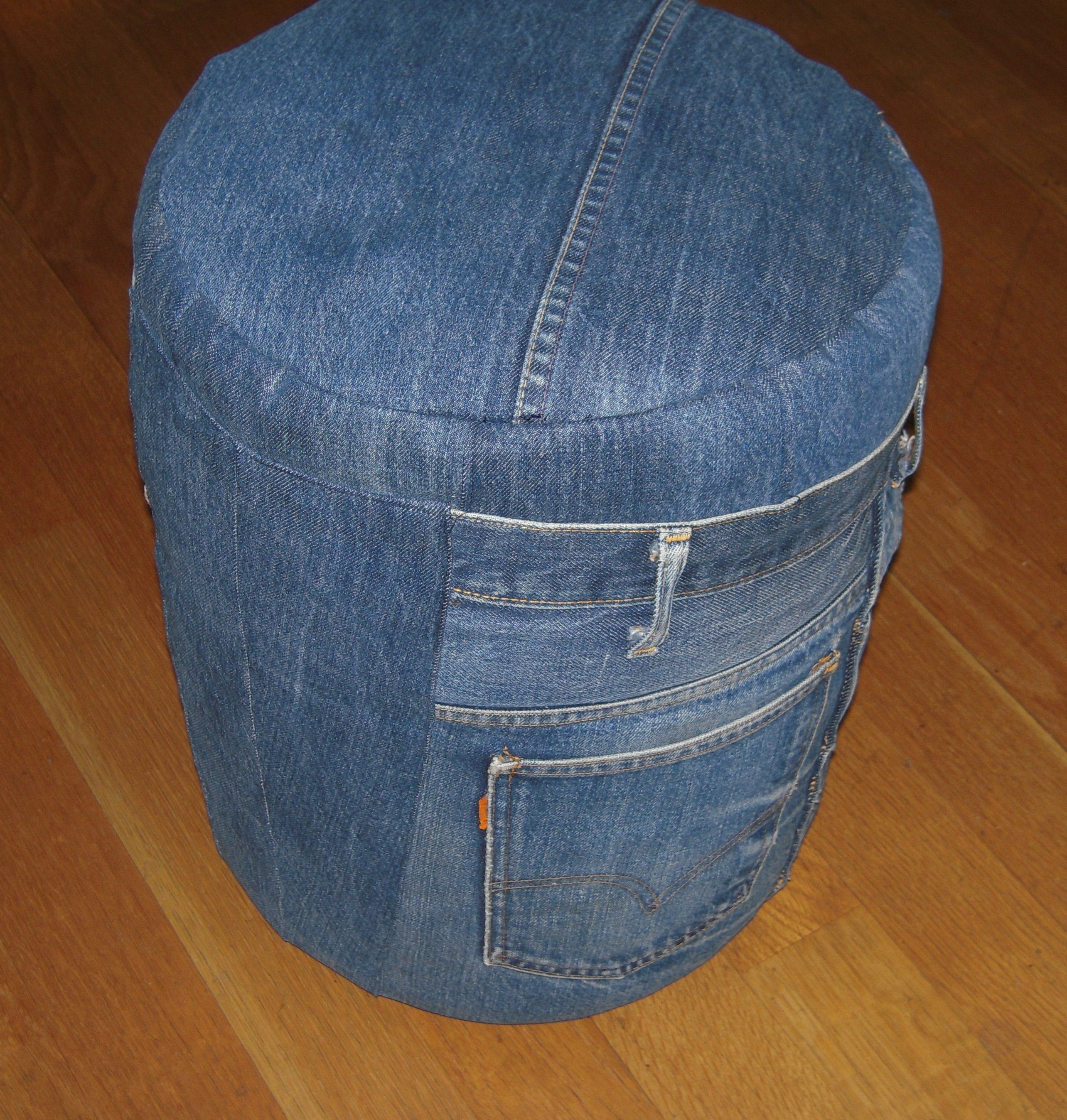古くてボロボロになったジーパンもなかなか捨てられず、バッグでも作ろうかとたくさん保存してありました。廃物利用なのだから失敗してもいいわと思い切って、スツールを作ってみることにしました。中に詰めた物は、発泡スチロールの容器・トレーなどを細かく刻んでパンパンに詰めると心地良い弾力性です。材料費ゼロで、満足の作品になりました。