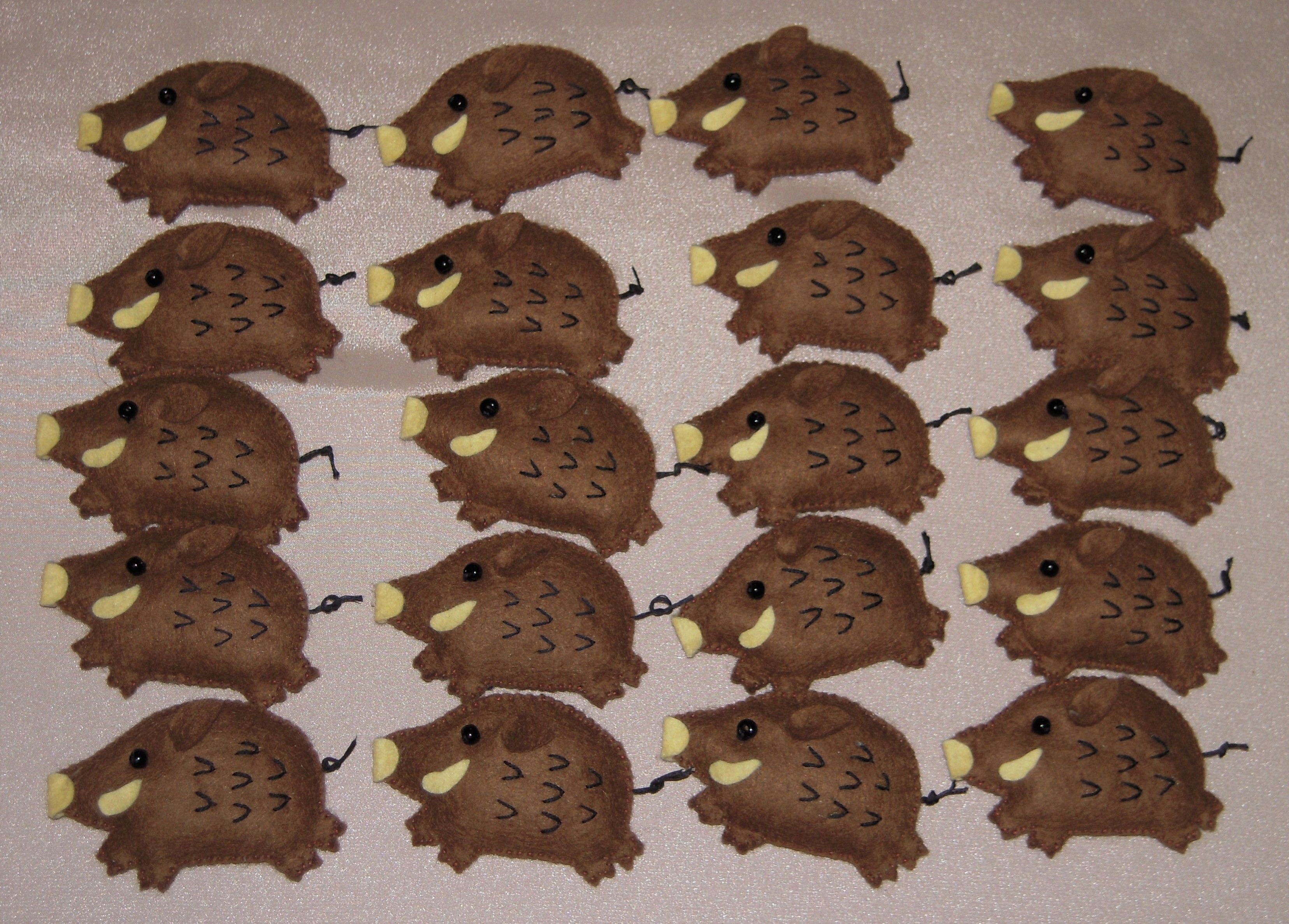 今年も作りました、干支マスコット イノシシです。イノシシでも可愛いものをと思いますが、なかなか難しいです。大きい方は商工会女性部の「交通安全干支マスコット」として、ひとり20個ずつの分担作業で、リボンと鈴を付けて完成。ちょっと縮小サイズは、自治会のボランティア用に30個作成します。