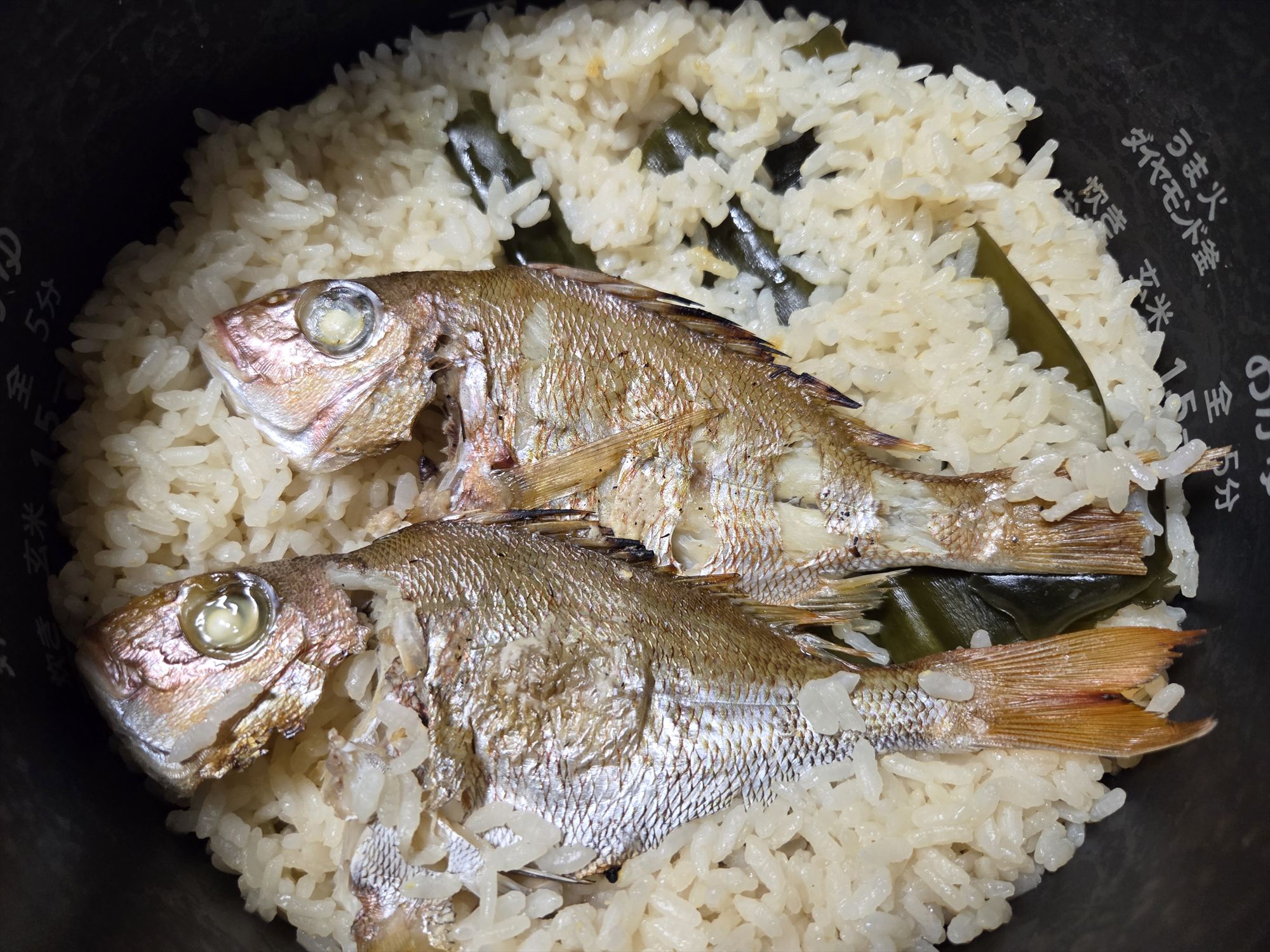 鯛めし は炊飯器で作ったのですが、まずタイを素焼きしてから炊飯器に投入。タイの旨味がしっかりとお米に染み込んで、最高に美味しかったです。
