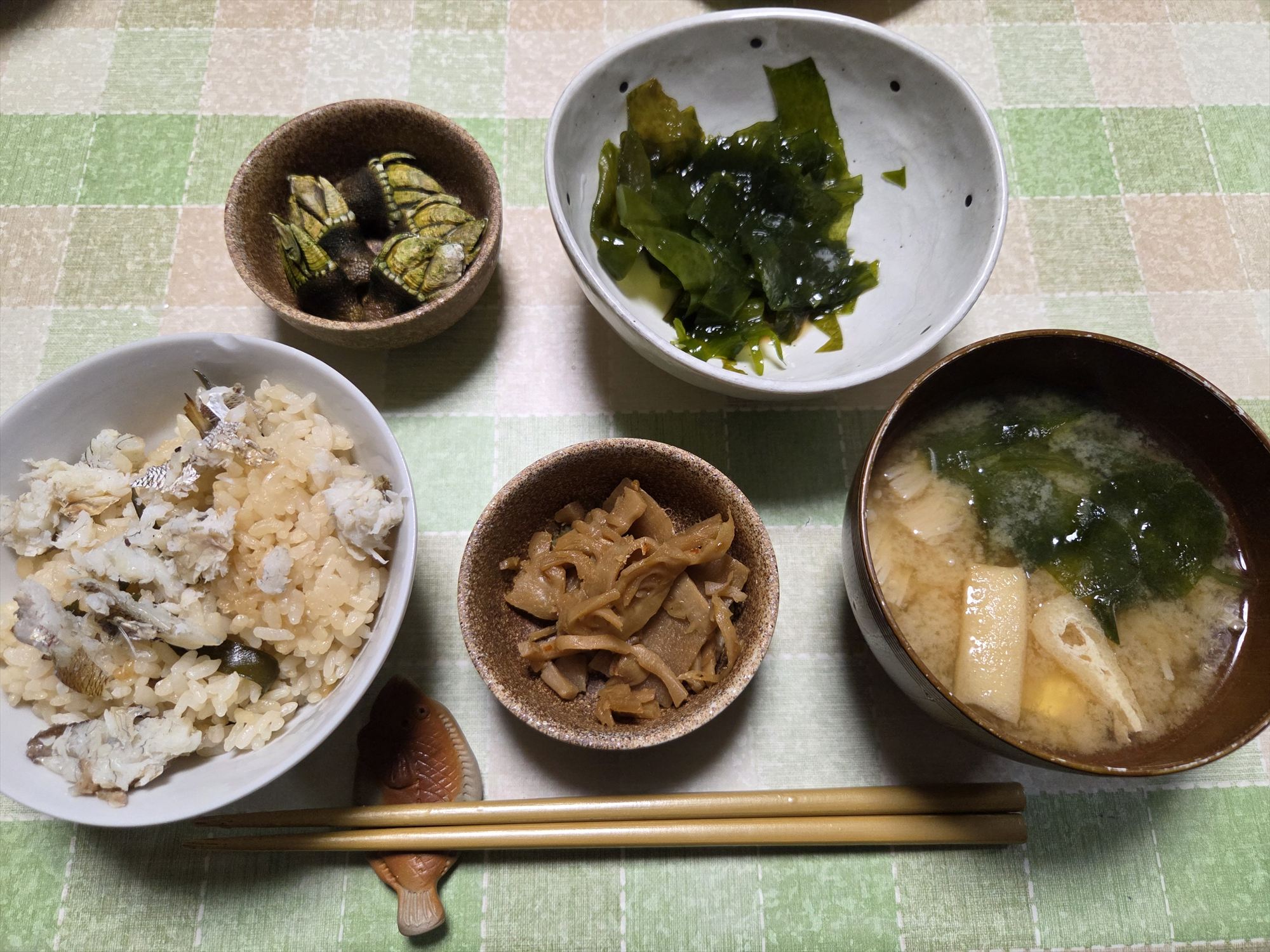 その日の晩ごはんには、自分で採ったワカメを使ったサラダや味噌汁、カメノテの塩茹で、そして鯛めしをいただきました。