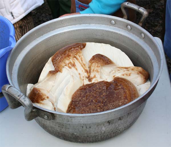 こんばんわ。ようめいです。昨日は凄い風でしたね。1ヶ月前の凶悪低気圧再びでしたね。首都圏のJR線が軒並み徐行や運転見合せでしたね。お陰で仕事がまともに出来なかったうえに、他の回らなかった人の仕事をやったりしていました。今日はボーイスカウトの新年会で、毎年恒例の餅つき大会でした。仕事の明けの関係で途中からでしたが、自分が到着した時には丁度餅を搗いているときでした。とりあえず写真を撮っていましたが、スカウトの子供たちの面倒を見ることになり、その場を離れることに。すぐ近くの神社の境内で「だるまさんが転んだ」や「氷おに」をやっていました。特に氷おに、非常にキツカッタ…。鬼の役で走り回ったのですが、いかに自分が運動不足かを知らされました。子供たちはすばしっこく逃げるのを追いかけまわる…。終わった頃には汗だくのクタクタ。そろそろと、元の場所に戻ると、既に餅は搗き終わっていて、小分けにして味付けしてありました…。ちょっ、オレ搗いてない…。一口大に分けた餅は、きな粉・黒ごま・納豆・大根おろし・青海苔・大福とそれぞれトレーにのせていくつかのテーブルに。それと、お雑煮。搗きたての餅だから美味い! いつもながらだけど美味い!子供らはそんなに食べないので結構余ってしまう。そこでいつもの事ながら、配給が。先輩が「20代限定」何て言いながら、箸で口元に持ってきます。逆らえません…。これが4順から5順して終了…。一度に3個の餅を口に入れたれた後輩も…。デザートでプリンが出てきました。ただのプリンではありません!バケツプリンです!夢に見たバケツプリンです!ただ残念なことに、器に明けた瞬間を見れず…。動画に撮りたかったのに…。自分が駆けつけたときには既に「デストローイ」してました。こちらも美味しかったです。器に盛り付けたプリン。盛り付けはお玉です。見た目はどんな食べ物か分かりません(笑)大好評のうちに終了。今回、新たに6人のスカウトが仲間入り。以前のように我が団にも活気が戻ってきました。