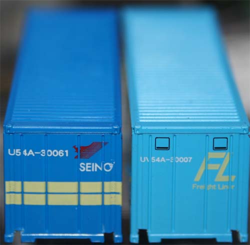 昨日、出勤前に例の模型屋に先輩たちと物色しに行きました。自分は特に何を買うというわけではなく、物色を楽しもうということで行きました。相変わらずの店内。ぉぃ、商品増えてないか!?2人づつの入店。他の2人は荷物番。先の2人は何良いものを見つけたようです。さて、自分らの番。自分が一番軽かったので、昇ってモノを見る係り。物色していたら、ヲ? マイクロの明星のタキ1900?「せんぱ~い、こんなのいつ出てたのぉ~?」「 お~、いつだったかそんなの出ていたなぁ」知らなかった…。日本セメントにするのに2セット4両購入。んで、今日の仕事の帰りにいつもの模型屋に行きました。ワーキングビークルの第8弾が出ているので箱買いしてきました。ウイングバンと鉄道コンテナ31ftがラインナップになっています。コンテナは「佐川」「FL」「西濃」「ブリジストン」の4種類。「店員さ~ん、このコンテナは貨車に載るの?」「爪はないけれど、何とかすれば載るよ」ということだったので購入決定。まさゆ~きの家に行き開封。シークレットは無し。とりあえず鉄道コンテナの4種類は出たのでコレだけをキープし、後の残りはまさゆ~きに売りました。(ありがと~♪)家に帰り、分解して箱だけにします。載せてみます。う、これは…。オーバースケールだ!貨車に積載させると2つの箱がピッタリくっついてしまううえに、長い…。こりゃ良いものが出たと思ったのに、ダメだこりゃ…。