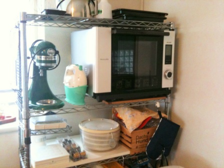 棚の上の部分を外して幅を広げた、そして古いオーブンレンジを外まで運んだ。