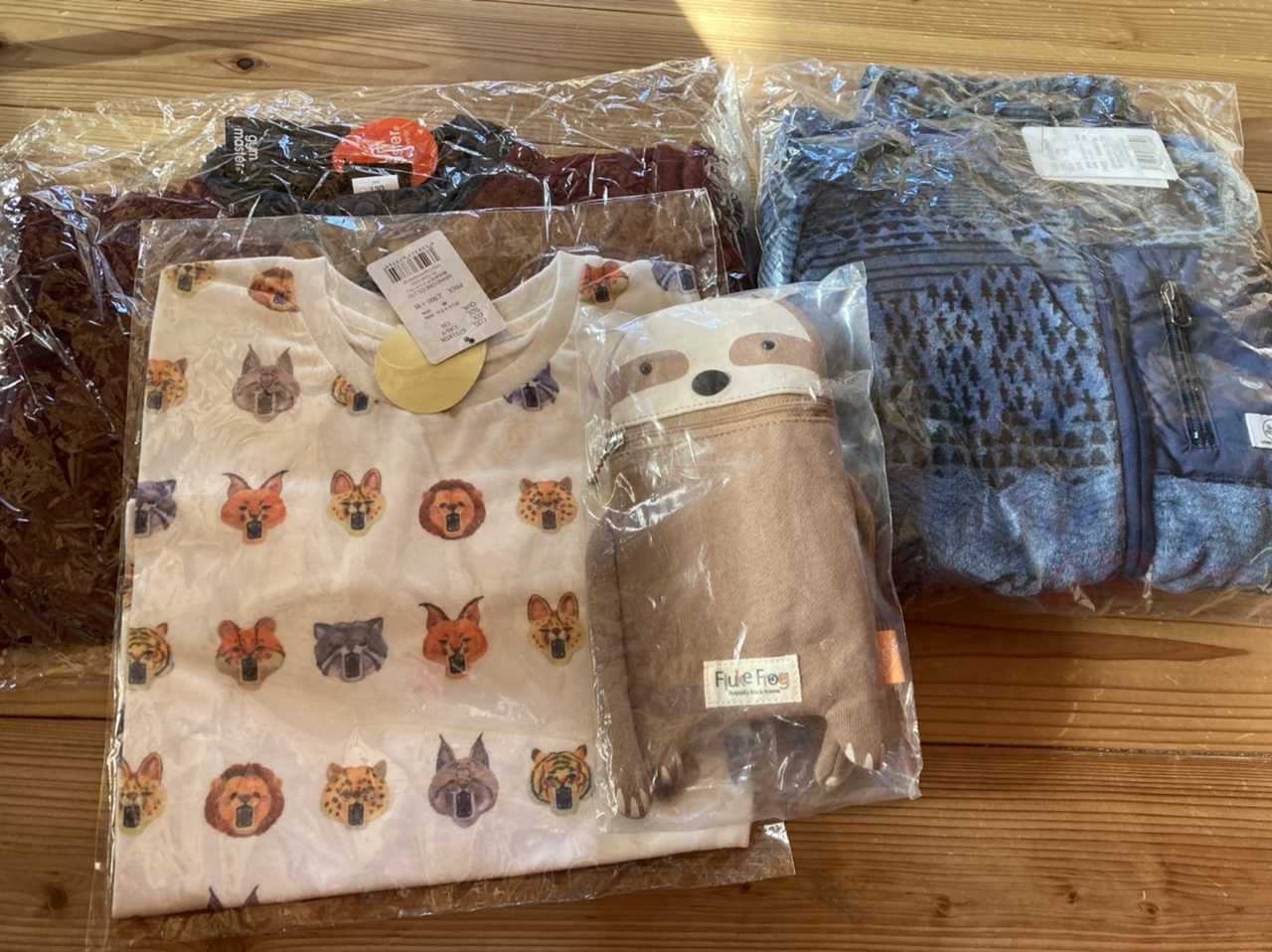 調べたら全部プロパー品で現在公式で販売していました。フリースのアウターもふわふわだし、スウェットとティシャツも可愛い。ナマケモノ🦥のポシェットは息子のカバンとして気に入ってくれました❤️