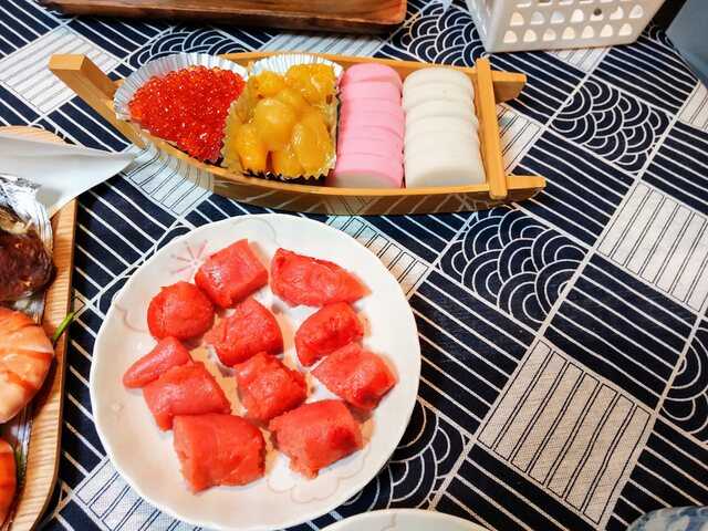 お船には、いくら・栗きんとん・かまぼこ。お皿に明太子