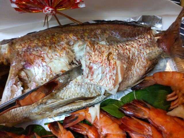 普段は切り身しか食べたことないけど、大物の真鯛を丸ごと焼いたのは初めてだよ~ ! (≧▽≦)
