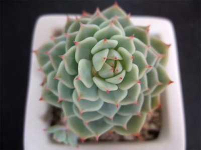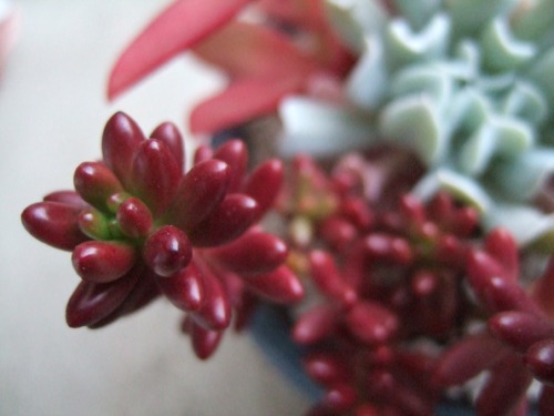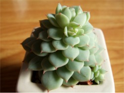 静夜 (2008/11/3)葉っぱの先っちょがポチっと赤くなっていてとても愛らしいです。今はぎゅっとしまっていますが、冬越しできても徒長するでしょうね。 購入当時 2008/5/5比べるとよくわかりますが葉の段がものすごく増えました。現在途中から、花芽らしき姿がチラホラ見えていますが、その成長はものすごく遅く、いつになったら咲くのか、実は子吹いているのかさえ判断できません。 紅稚児(と思われる)ミニベルこれは紅稚児かどうか自信ないんですけど、以前会社の同僚からいただいた寄せ植えに入っていたエケベリアです。露の時期に茎立ちしたので、ぶった切りしました。水を辛くしたのでギュッとしていますが、ネットで調べる紅稚児は葉っぱがもっと肉厚なんですよね。でも紅葉が似ている。やはり寄せ植えには最適ですね。バラシちゃったから意味無いけど・・・。本当の名前は何だろう??? で、茎から出た子がこちらですなーんにもないツルツルの茎から芽が出ちゃうんですから、 生命力の強さがわかりますよね。来年はこれを使って寄せ植え作りたいな。 来年は、来年は、っていろいろ構想を練っているけど、寒さでやられたら元も子もないんだよね。厳しい信州。やっぱり温室導入するべきだろうか?すごーくすごーく 真剣に悩んでいます。誰ですか?( 悩みがこんなんで幸せだな )なんて言ったのは(。・ε・。)ムー 「紅稚児」だと思っていたけれど、葉の厚さに納得がいかず調べた結果、より有力な情報に遭遇しました!今後、「ミニベル」に訂正させていただきます。