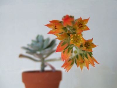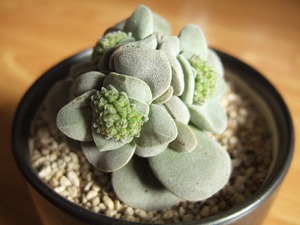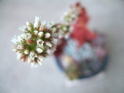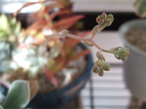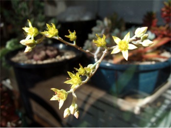 ガラス温室の多肉植物は快適昼間、温度計が22度まで上がっていました。晴れの日はガラスを少し開けておく方がいいかな。まだ今週はヒーターの出番はなさそう。 白星が全部で 7つの花を咲かせました。終わった花はしぼんで、羽の中に隠れてしまいます。昼間、陽が当たっているとガラス温室の隙間から、とても良い香りがしてきますそして、周りの小さい固体にもツボミが見えてきました。いったいいくつ咲くのでしょう。本体が弱らなければいいんだけど・・・。