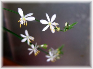 オリヅルランの花 (2008/8/16) ぜんぜん珍しくはないですが、このオリヅルランの苗が我家に着たのは2年前の10月、 このブログを始めた頃に唯一あった園芸植物でした。(ランナーから出た小さな苗を分けていただきました) それが今年やっと花が咲いたんです!とても感動しましたヽ(=´▽`=)ノヤッタァ! 花は1日で落ちてしまうんですね~。でもツボミがいくつも出て次々と咲きました。 そして、もっと感動したことは種ができたこと!(2008/10/23) 花が落ちる前に、 メンボウで人口受粉させると、受粉できた花は落ちずに閉じたままランナーに留まります。しなびた花がずーーっとくっついたままです。忘れた頃、やがて緑色の種の袋が見えました。その袋は成長し、写真のように自然と口を開きます。中に7個の黒い種が入っていました。せっかくなので来春植えてみようと思って保管しています。実生なるか?! もちろんそんなことしなくてもランナーから苗はどんどん増えたので、小さな鉢に植え付けしましたよ。 わかったこと :初心者にも育てやすい!
