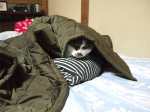 新しい年があけました今年も宜しくお願いします。亀レスで申しわけありません!ボチボチ更新していきますので、気長にお付き合いくださいませ<m(__)m> 年末はメチャメチャ忙しかった~!お休みは4日まで。皆様、どんなお正月をお過ごしでしょうか?こちら信州はお天気も良くて穏やかなお正月です明日は姉達が遊びに来るので、ご馳走太るな~。 コナツは毎日、ベランダで日光浴をしています。でもこちらは空気が乾燥していてとても寒いのでお昼寝中は、写真のように毛布を着せています。ある程度すると鳴いて部屋に入りたいと言うのでまた湯たんぽのあるダウンの中で眠ります。コナツは、ほとんど眠ってすごしていますよ。長い休みなので、一緒にいられて安心です ずーっと休みなら良いのになぁ~。