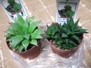 今日、イオンの園芸コーナーで見つけちゃいました。入荷したばかりと見られる鮮度抜群のハオルチア。 左が「祝宴」 右が「五重の塔」ハオは管理が難しそうだから増やさないって思っていたのだけど、やっぱりカッコイイですね~!気付いたらレジで会計してました。この名前も気に入った!正月らしくて縁起良さそういっぱい子吹いているので、春になったら植え替えしたいです。今年も、趣味の園芸を楽しむぞ