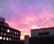携帯で撮った下の3枚の写真。仕事中に窓から見えた景色です。今日の夕方、西の空が突然燃えるような夕焼けに覆われました。火事?って思うぐらいに、それは奇麗を通り越して異様な光景でした。隣の席の人にも教えたら、すごく不気味がっていました。ホントに、何だかわからないけど、ゾワーって鳥肌立った。 今日はちょっぴり気分が落ち込み気味。周りのテンションの高さに付いていけなかった・・・。 普段なら許せる事が、許せなかった。きっと疲れているのよねーワタシ。朝は早起きして、気分を変えなくちゃ