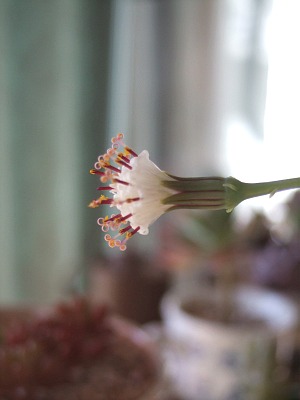 こんな花がさくなんて意外!グリーンネックレス(緑の鈴)の花が咲きました。なんて可愛いんでしょう。噂では「白くつまらない花」 なんて聞いていたのですがよーく見ると雌しべがピンクでクルリンパ!です。真っ白い小さな花が集まっていて、横から見るとドレスのフリルのよう。 全体像はこちらです実際はご覧のとおり小さいんです。でも小さくても冬に花が咲くのは嬉しいですね~