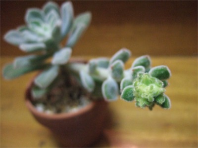 お気に入りのフロスティのツボミが膨らんできました。 ↓プルビナータフロスティ 2008/10/17撮影 ↓2008/11/3撮影 だいぶふっくらして、ツボミらしくなっています。ちょっぴり紅葉して葉先のピンクがとってもキュートしかし、ここまで伸びるとは思わなかったなぁ。開花が楽しみ! 2008/5/3 イボのような花芽を見つけた。半年かけてやっとツボミ~。当時の様子 ところで、朝晩寒くなりましたね。 今朝、ダウンジャケットを着て出勤しました。帰りは思ったほど寒くなかったので、会社から駐車場まで歩いたら、汗が出てしまいました。やっぱりダウンはちょっと早かったかな??帰宅してからベランダに出してある多肉達を室内へ移動。異常なし! そして、こちらの多肉も異常なしでも私の枕で寝るのはやめて~!